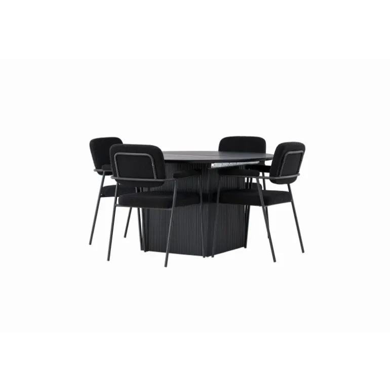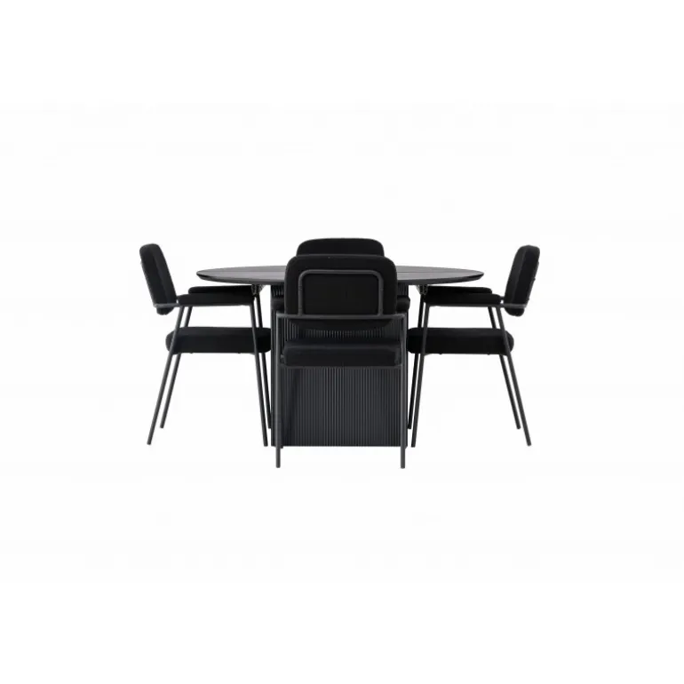 Et sort spisebordssæt i skandinavisk stil, der kombinerer tidløst design med smarte funktioner! Vores runde spisebord Matilda er skabt til at passe perfekt til dine behov. Med sin runde top i sort fineret MDF og det robuste stel med blokformede ben tilføjer Matilda et stilfuldt touch til dit hjem. Bordet er udtrækkeligt og kan hurtigt transformeres til et ovalt bord, når du har familie og gæster på besøg. Bordets diameter måler 130 cm. For at komplementere det smarte spisebord kombinerer vi det med sorte stole fra Yesterday-serien. Disse trendy og komfortable spisebordsstole står tidens prøve. Stolen har et fuldt polstret sæde i sort boucléstof, hvilket giver en elegant og luksuriøs følelse. De slanke sorte metalben giver ikke kun stabilitet, men de integrerede armlæn giver også ekstra komfort og støtte. Med Matilda spisebord og stole fra Yesterday-serien får du ikke kun et praktisk og funktionelt spisebordssæt, men også et stilfuldt og elegant indretningsdetalje, der vil gøre dig stolt af dit hjem!