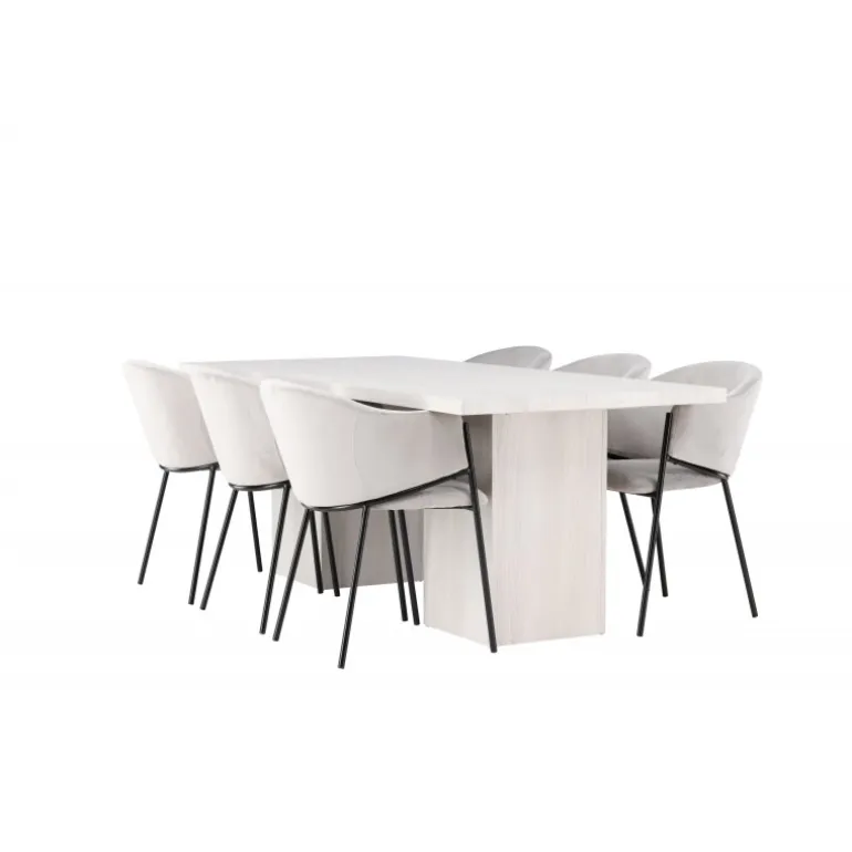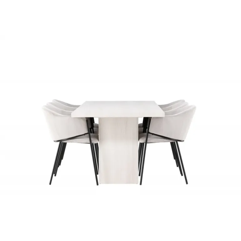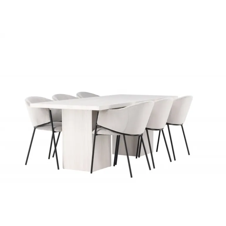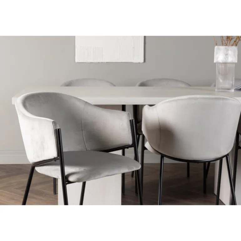 Indret dit hjem med behagelige farver, bløde materialer og rustikke former, og opnå en fuldendt kombination af det moderne og tidløse! Vores hvidvaskede spisebord Olga er en fryd for øjet med sit robuste design og skandinaviske stil. Den rektangulære bordplade i hvidvasket MDF giver en følelse af lys og rum i rummet. De solide, blokformede bordben matcher perfekt og skaber et solidt fundament for måltiderne. Bordets dimensioner: 200x75cm. Sammen med vores rektangulære spisebord tilbyder vi vores lysegrå Evelina spisebordsstole. Deres moderne udtryk og slanke design skaber en luksuriøs ramme omkring spisebordet. Sædet er fuldt polstret i et blødt lysegråt velourstof, og ryglænet er smukt buet for ekstra komfort. Den minimalistiske sorte stålramme giver stolen et strejf af elegance og stabilitet. Når du sætter dig ved dette Spisebordssæt, vil du straks føle en følelse af afslapning og eksklusivitet. Skab en charmerende atmosfære i dit hjem og få et sted, hvor både familie og venner kan samles og sidde komfortabelt!
