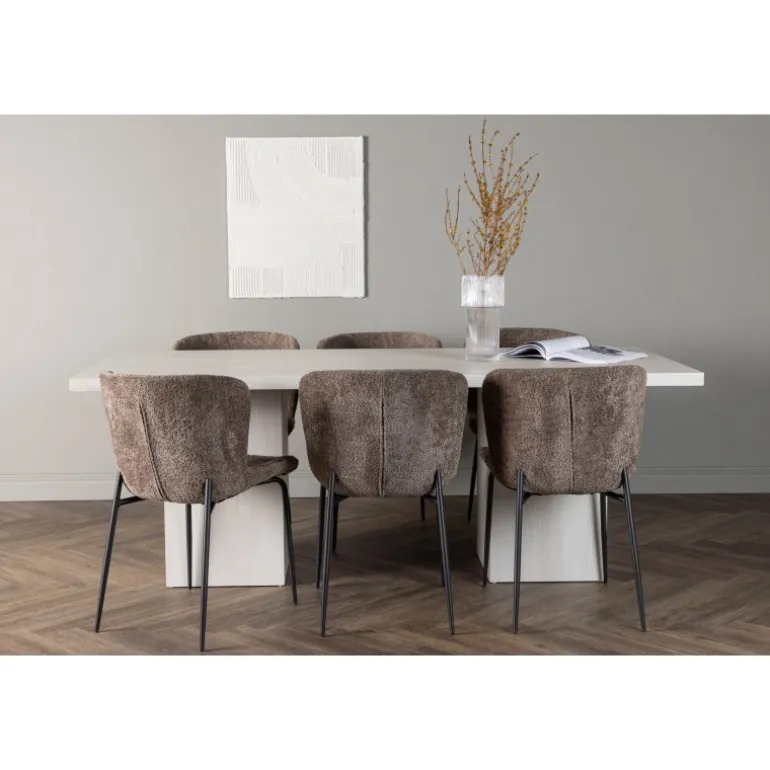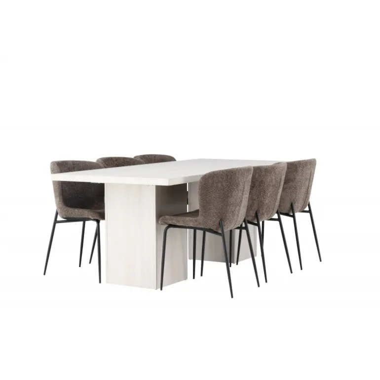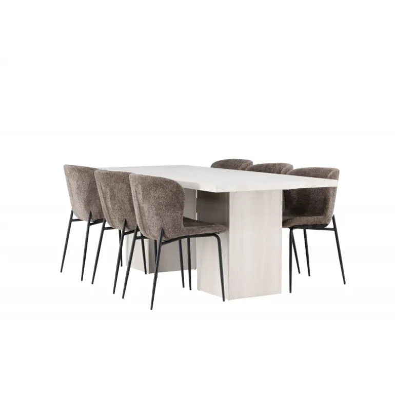 Velkommen hjem til et fantastisk fokuspunkt i stuen, hvor vores vidunderlige Spisebordssæt i skandinavisk stil sætter tonen! Vores rektangulære spisebord Olga klatrer hurtigt op på trendlisterne, og det er ikke svært at forstå hvorfor. Med sin hvidvaskede finish bringer det en følelse af lys og friskhed til rummet. Den rektangulære bordplade i hvidvasket MDF er ikke kun smuk at se på, men også nem at rengøre og holdbar nok til at modstå hverdagens krav. Med to robuste, blokformede bordben i samme materiale får du en stabil og pålidelig base for dine måltider. Borddimensioner: 200×75 cm. Her i en vidunderlig kombination med stole fra Modesto-serien. Disse stole er fuldt polstrede i grå, fluffy bouclé-stof, som skaber en hyggelig og indbydende følelse, mens de passer perfekt til den skandinaviske stil. Stolene har slanke, slanke stoleben i sort metal, hvilket tilføjer et moderne touch til dit hjem. Den let afrundede ryg og polstrede sædepude giver ekstra komfort, så du kan nyde lange, afslappende middage med venner og familie. Kan det blive bedre end dette? Med dette rustikke Spisebordssæt kan du skabe en harmonisk atmosfære i hjertet af dit hjem, hvor din personlige stil kan skinne!