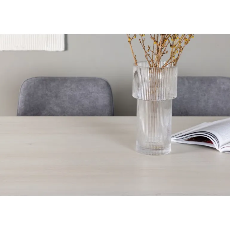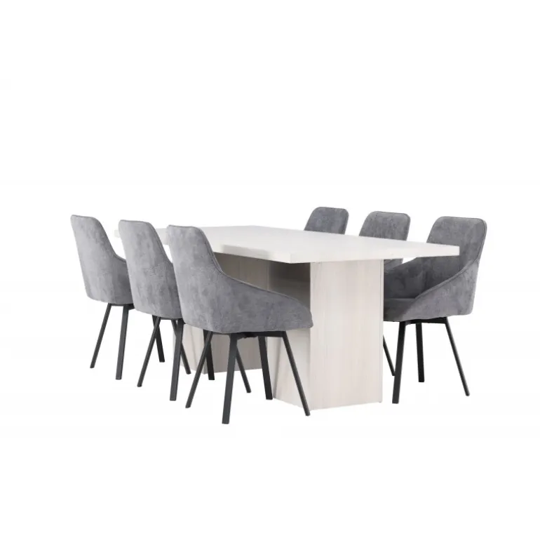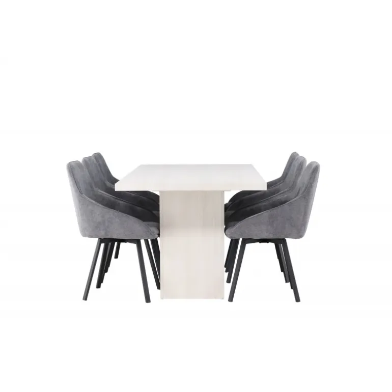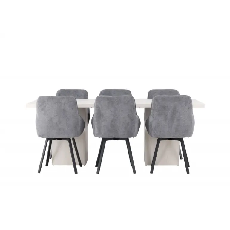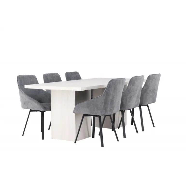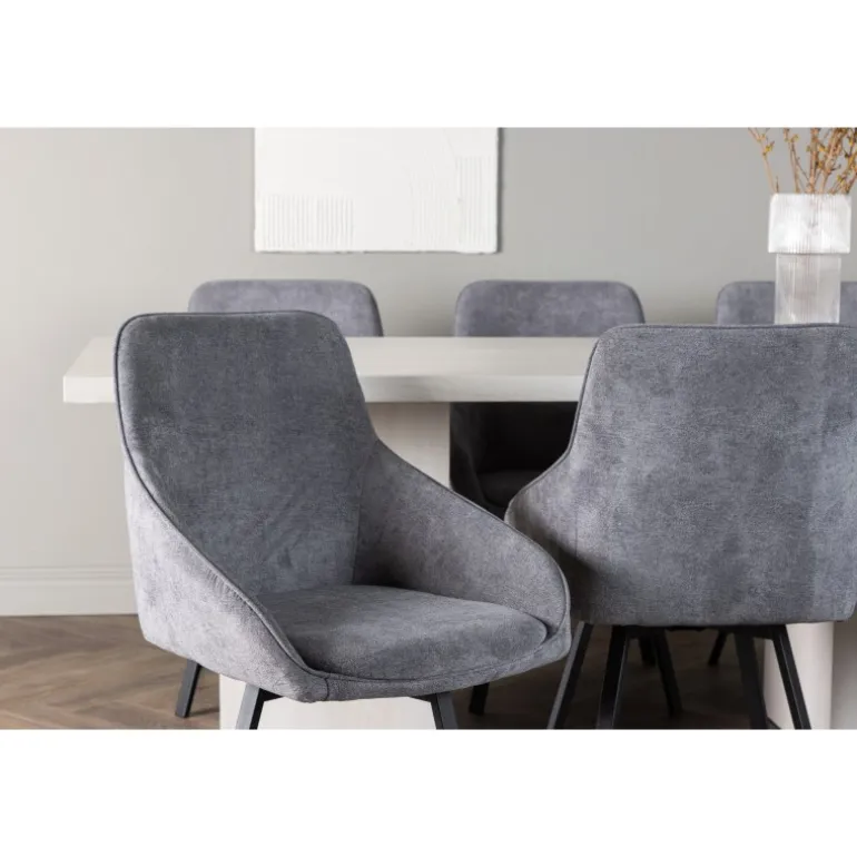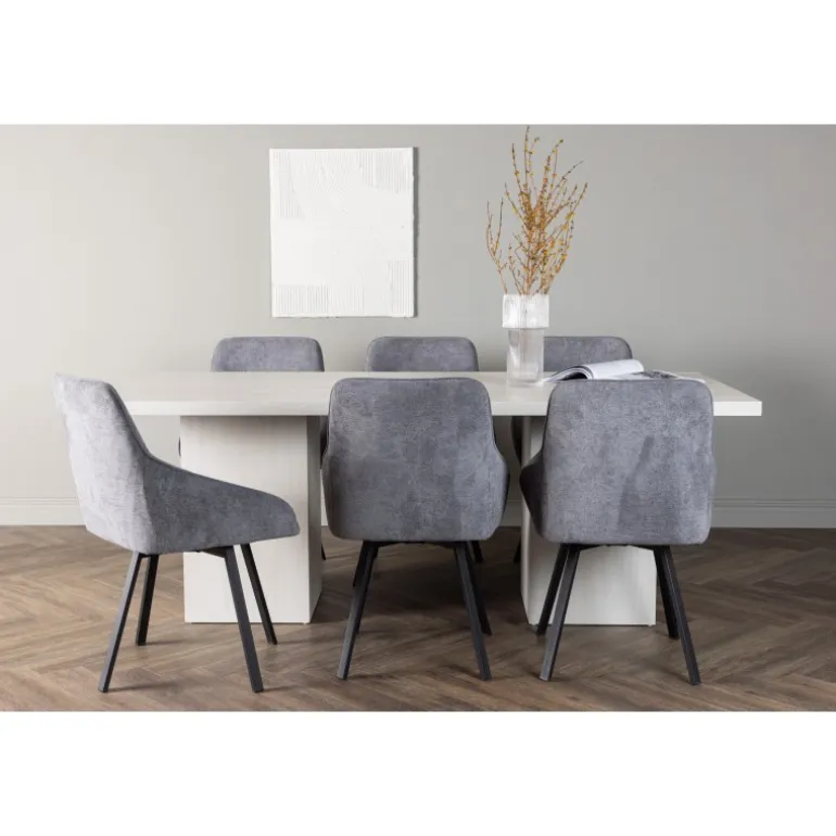 Skab tidløs elegance med dette robuste rustikke Spisebordssæt – en skandinavisk indretningsdrøm til dit hjem! Vores hvidvaskede spisebord Olga har en glat finish og et solidt design. Bordpladen, lavet af hvidvasket MDF, giver en jævn overflade, mens de to solide, blokformede bordben i samme materiale sikrer stabilitet og holdbarhed. Bordets dimensioner: 200×75 cm. Her, i perfekt kombination, er vores grå spisestole fra Rosie-serien. Stolens skandinaviske design er en fryd for øjet med en fuldt polstret sæde og integrerede armlæn i grå stof. De sorte metalben på stolen har en let udadgående bue, hvilket skaber en luftig følelse i din indretning. Det polstrede sæde tilbyder vidunderlig komfort, så du kan nyde hvert øjeblik af dit måltid. Dette er den perfekte kombination af stil og komfort til dit hjem. Indret med tidløse trends og lad den tid, du tilbringer her med dine kære, blive dagens højdepunkt!
