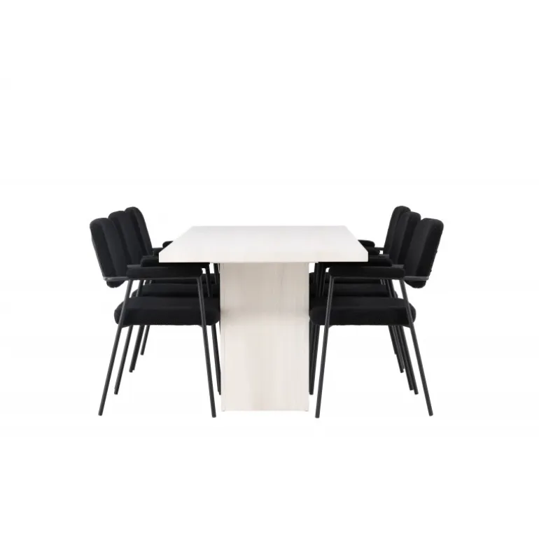 Skab et imponerende midtpunkt i hjertet af dit hjem, der sætter tonen i stuen med sit robuste design og dejlige materialer, der inviterer til lange middage! Olga er vores rektangulære spisebord med en hvidvasket MDF-bordplade og to solide, blokformede bordben lavet af samme materiale, hvilket gør det til en fantastisk smuk interiørdetalje. Med sit slanke og robuste design fanger det øjet og imponerer gæsterne. Bordet måler 200×75 cm. Kompletter dette fantastiske spisebord med vores sorte spisebordsstole fra Yesterday-serien. Stolens sorte bouclé-stof tilføjer et sofistikeret touch og føles vidunderligt blødt mod huden. Med sine slanke stoleben og integrerede sorte metal-armlæn får du ikke kun en stilfuld og moderne stol, men også ekstra komfort. Sammen skaber Olga spisebord og Yesterday stole en harmonisk og indbydende atmosfære, hvor du og dine gæster kan samles til mindeværdige måltider. Giv din spisestue et ekstra løft med dette enestående Spisebordssæt – en kombination af stil, komfort og funktionalitet!