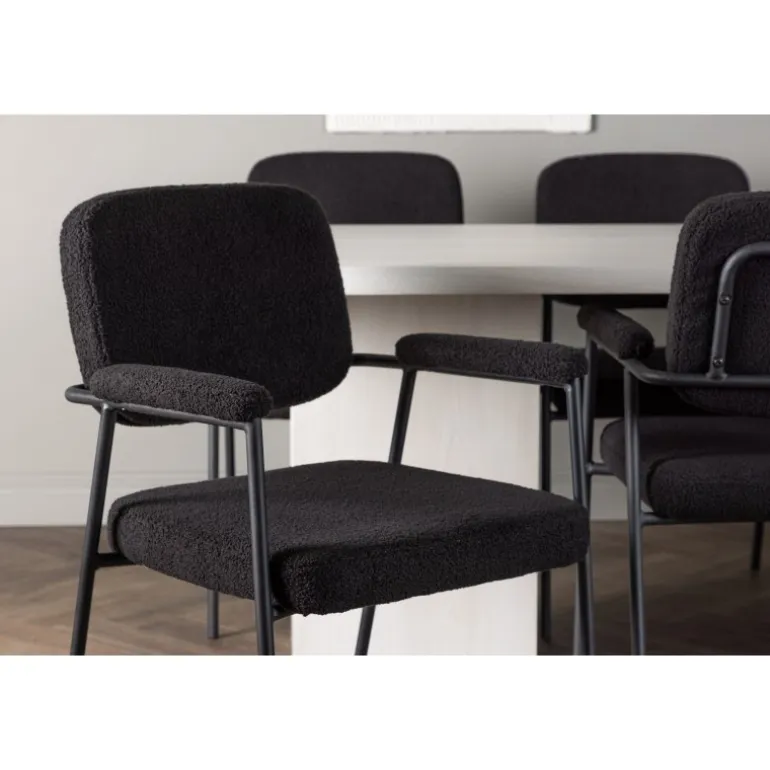 - Stilfulde stole: Sorte bouclé-stof, slanke stoleben og integrerede metal-armlæn.