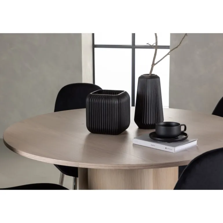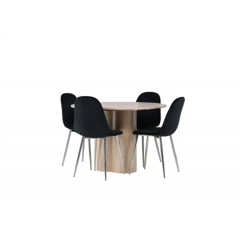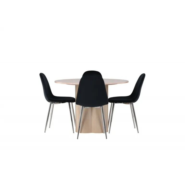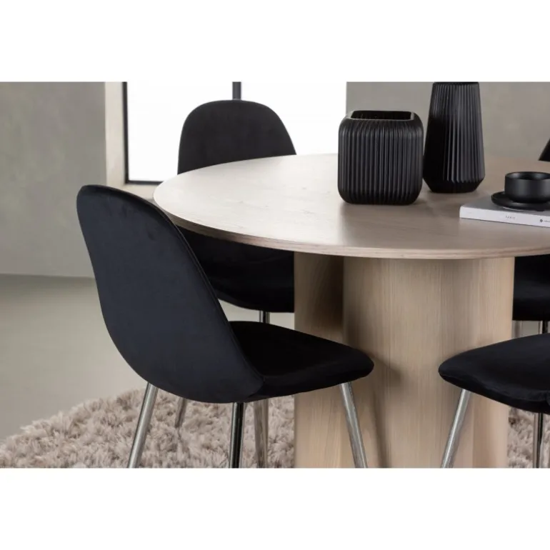 Indret dit hjem med stilfulde kontraster, fløjlsagtige materialer og moderne former – dette spisebordssæt har alt, hvad du behøver for et elegant interiør! Vores runde spisebord Olivia imponerer med sin skandinaviske design og smagfulde layout. Med en konsistent overordnet design i hvidvasket MDF får du en perfekt kombination af stil og funktionalitet. De tre cylinderformede ben, samlet under midten af bordet, tilføjer et moderne touch og skaber en stabil og robust base for bordet. Dimensioner: 110 cm. Sammen med vores hvidvaskede bord Olivia får du sorte spisebordsstole fra Polar-serien, der tager din komfort til nye højder. Polar byder på et fuldt polstret design med krommetalben, hvilket bliver en stilfuld detalje for det samlede udseende. Den let rundede ryg og den slanke siddeflade i sort fløjlstof, let polstret for ekstra komfort, inviterer til lange og afslappede måltider. Med Olivia og Polar spisebordssæt får du ikke kun en praktisk løsning til din spisestue, men også en atmosfære, der får dig til at føle dig velkommen og afslappet. Hvert enkelt detalje er nøje udvalgt for at skabe en følelse af stil og eksklusivitet. Hvad mere kan du ønske dig?