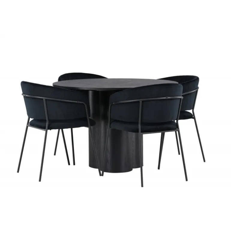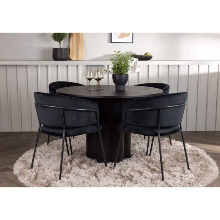 Kombiner skandinavisk elegance og moderne trends. Du behøver ikke gå på kompromis med stil og komfort! Vores sorte spisebord Olivia er virkelig et syn for øjet. Den tynde og runde bordplade lavet af holdbart MDF giver en stilfuld kontrast til bordets robuste ramme, som består af tre cylindriske ben samlet i midten. Bordets dimensioner er 110 cm. Sammen med vores runde spisebord Olivia følger de sorte spisebordsstole Selma. Med deres fuldt polstrede design og let buede rygge vil du føle dig inviteret til at slappe af og nyde hvert øjeblik omkring spisebordet. Den fløjlsagtige polstring og stilfulde dekorative sømme giver stolene en luksuriøs følelse. Endelig bliver de slanke sorte stålben en stilfuld kontrast til det bløde stof, der på en subtil måde komplementerer det overordnede design. Med spisebordssættet Olivia og Selma får du ikke kun et funktionelt og smukt møbelsæt, men også en oplevelse, der vil få dig til at føle dig hjemme. Indret din stue eller køkken med stil, og lad disse møbler blive et samlingspunkt!