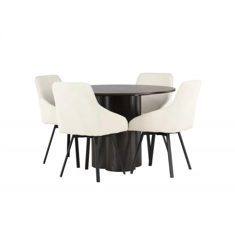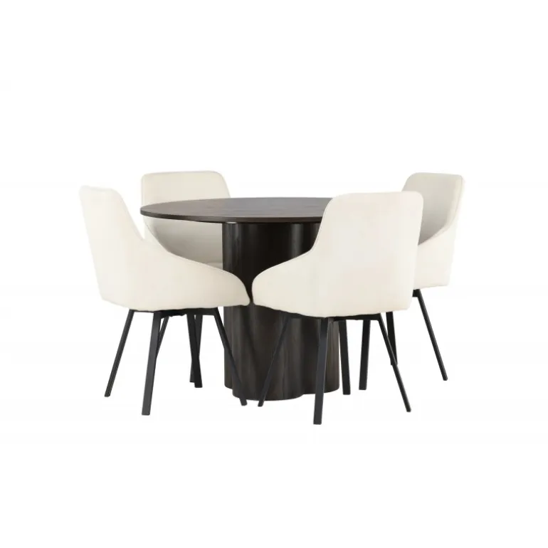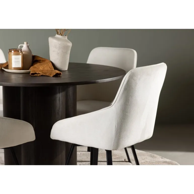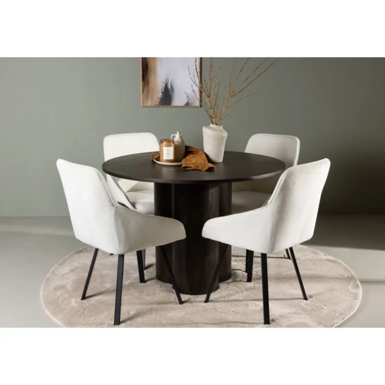 Skab et midtpunkt i stuen, der imponerer familie og venner. Her får du et spisebordssæt, der kombinerer skandinavisk design med smagfuld elegance! Dette runde vintagebord med moderne design hører til Olivia-serien. Bordet har et gennemtænkt design med en tynd, rund bordplade og tre cylinderformede ben, der konvergerer i midten af bordet. Den stilfulde mocca farve er også helt i tråd med de aktuelle trends. Bordets dimensioner: 110 cm. For at skabe det ultimative spisebordssæt har vi kombineret Olivia-spisebordet med stole fra vores populære Rosie-serie. Stolene har fuldt polstrede sæder og integrerede armlæn, der tilbyder både stil og komfort. Det beige stof giver en varm og indbydende følelse, mens de let udadvendte sorte metalbens tilføjer et moderne touch. Når du sidder i disse stole, vil du straks føle den luksuriøse komfort. Det blødt polstrede sæde former sig perfekt efter din krop, hvilket giver dig et behageligt sted at nyde lange middage og dejlige samtaler med familie og venner. Det skal føles godt at komme hjem!