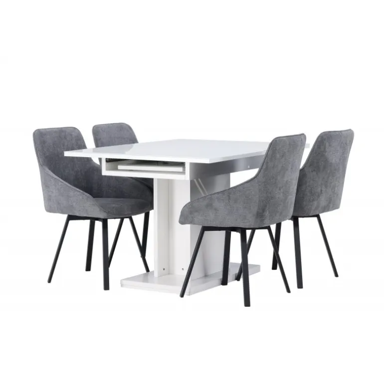 Lad din stue sætte tonen for din indretningsstil og møblér den med dette smarte Spisebordssæt, der kan forlænges efter behov! Dette imponerende spisebord, Pluto, er den perfekte tilføjelse til dit hjem. Med en MDF-bordplade og en glasoverflade har det et sofistikeret og moderne look, der vil imponere dine gæster. Bordet har en solid, centralt placeret base, der giver fremragende stabilitet, og dets udvidelsesfunktion gør det perfekt til både små og store sammenkomster. Bordets dimensioner: 120/160×90 cm. Sammen med de grå stole fra Rosie-serien er Spisebordssættet komplet. Disse dejlige stole i skandinavisk design vil tilføre et moderne touch til dit spisebord. Det fuldt polstrede sæde i gråt stof og de let udadgående sorte metalben skaber en perfekt balance mellem komfort og stil. Den bløde polstring i sædet inviterer dig og dine gæster til at slappe af og nyde lange og behagelige middage. Skab en atmosfære af hyggelig komfort i din stue. Her vil du opleve luksus af høj kvalitet design og funktionelle detaljer, der vil gøre hvert måltid til en dejlig del af dagen!