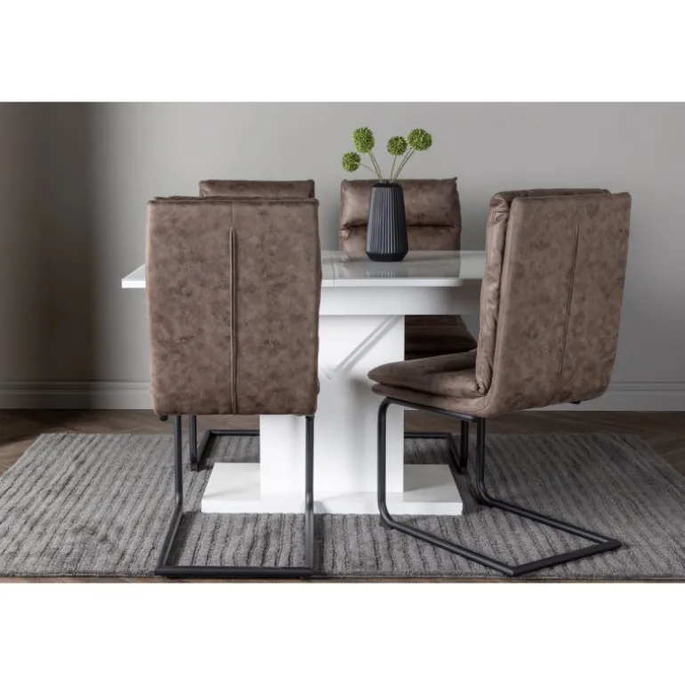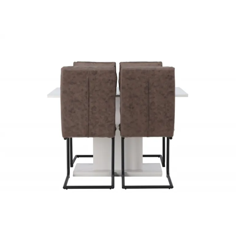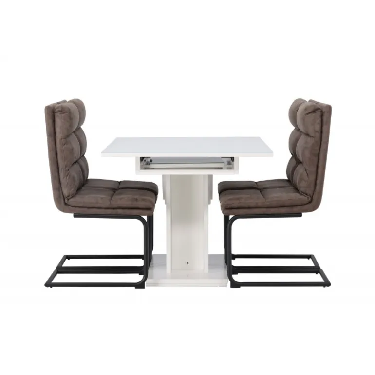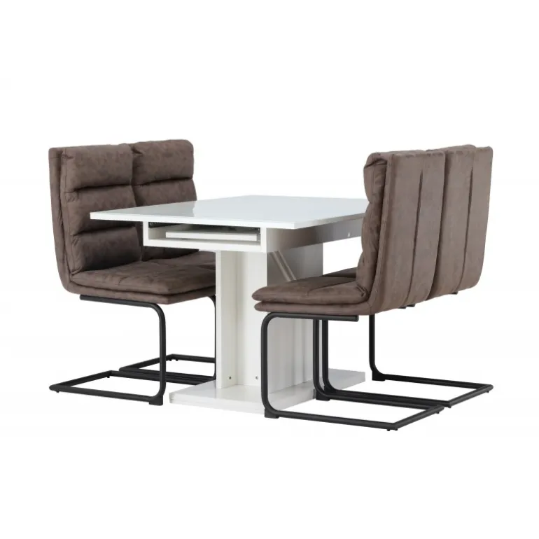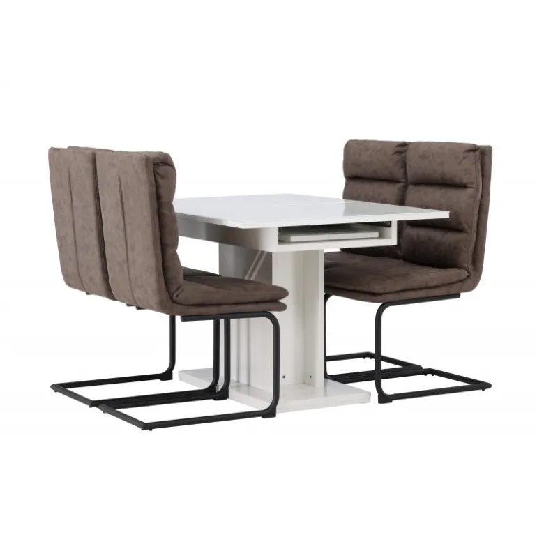 Sid komfortabelt og nyd hyggelige måltider omkring et Spisebordssæt, der kombinerer funktionalitet og stil på bedste vis! Vores rektangulære spisebord Pluto tilpasser sig dine behov med en udtrækbar bordplade i hvid MDF med en elegant glasplade. Bordets robuste og centralt placerede base sikrer også et stabilt spisebord, du kan stole på. Bordets dimensioner er 120/160×90 cm. Sammen med de brune stole fra Zizo-serien bliver Pluto Spisebordssættet endnu mere imponerende. Disse nordisk-designede stole, i en rustik mørkebrun farve, er et perfekt supplement til spisebordet. Lavet af holdbar mikrofiber og med jernbensramme, tilbyder de en holdbarhed, der vil stå tidens test. Designet af benene giver desuden en fleksibel fornemmelse, der er utroligt behagelig. Skab en atmosfære af sammenhold og luksus i dit hjem med dette Spisebordssæt. Her kan du rumme både små og store sammenkomster uden at gå på kompromis med stil og komfort!