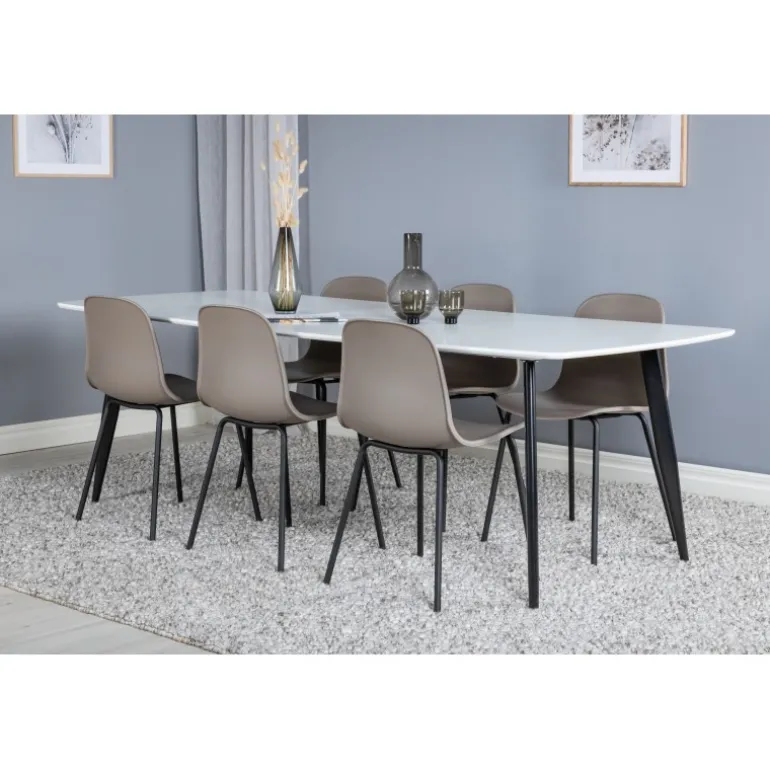 Praktiske khaki-farvede spisestole fra Arctic-serien sammen med et pompøst spisebord fra Polar. Her får du en kombination, der er let, robust og moderne. Saml familien til gode middage og socialt samvær!