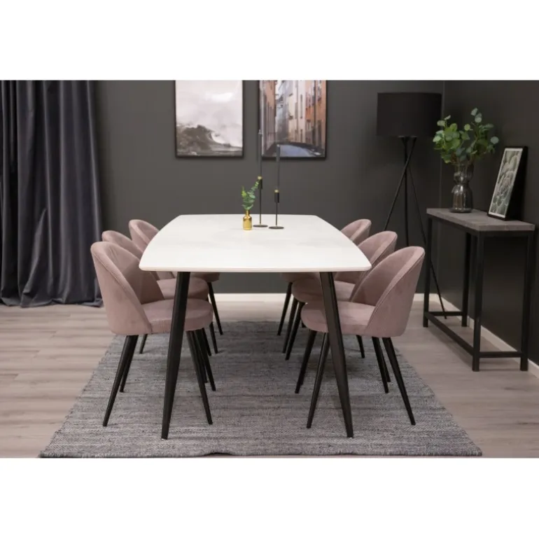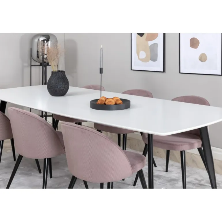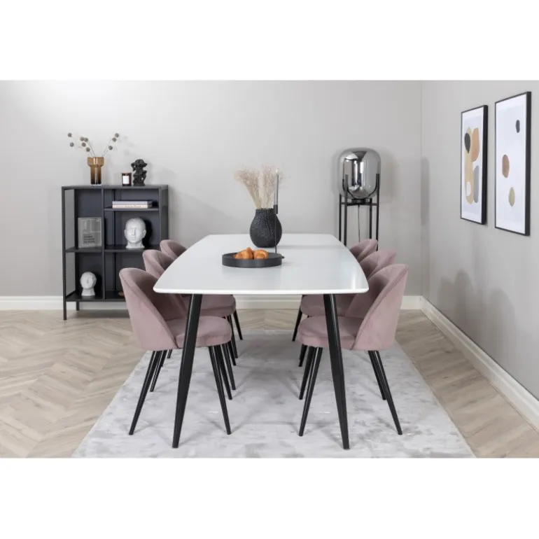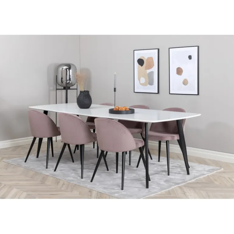 Spisebordssæt Polar med hvid bordplade og sorte ben sammen med de pompøse lyserøde fløjlstole forbedrer indtrykket i enhver spisestue. Dette elegante og hyggelige Spisebordssæt er den perfekte tilføjelse til dit hjem. MDF-bordpladen er både stilfuld og funktionel, men kræver forsigtig pleje for at undgå ridser og skader. De lyserøde fløjlstole giver en luksuriøs følelse og komfort, hvilket gør hvert måltid til en fest.