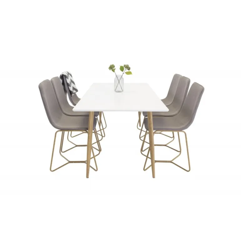 Det moderne spisebordssæt i serien Polar sammen med spisebordsstole i serien X-Dining. Skab noget stilfuldt og socialt med plads til god mad og socialt samvær! Bordpladen er lavet af MDF og er hvid, mens stolene kommer i en elegant grå og naturfarve. Perfekt til daglig brug og særlige lejligheder.