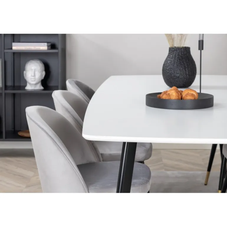 Oplev en vidunderlig og indbydende kombination af både farve og materiale med Spisebordssæt Polar. Dette stilfulde og moderne Spisebordssæt består af et Polar Ellipse spisbord og grå velour spisestole, der skaber en elegant atmosfære til mange hyggelige middage i godt selskab. Bordpladen i hvid MDF er både robust og stilren, men kræver forsigtig vedligeholdelse for at undgå ridser og skader. Det er vigtigt at bruge en blød klud til daglig rengøring og straks tørre eventuelle spildte væsker op.