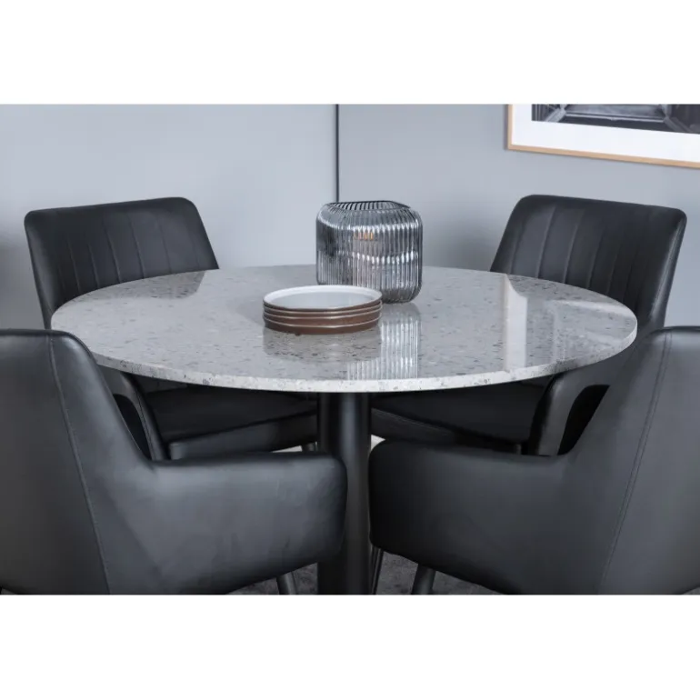 - Kvalitetsmaterialer: Bordplade i terrazzo og stole i PU med metalramme for holdbarhed.