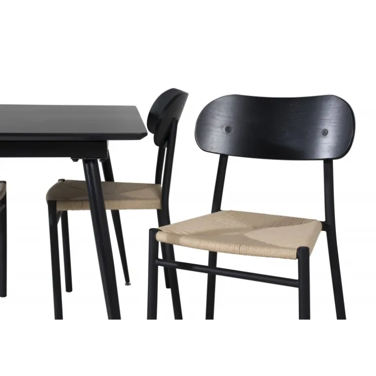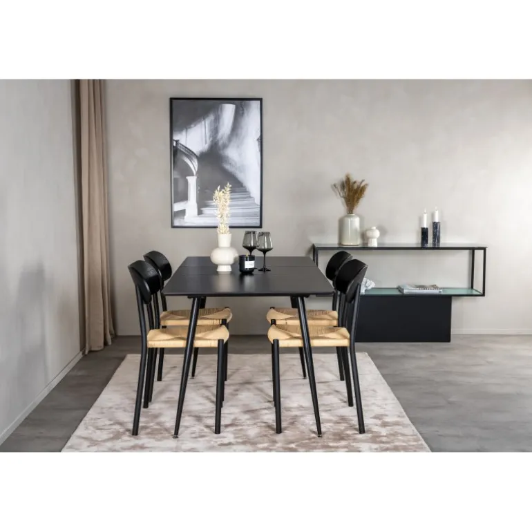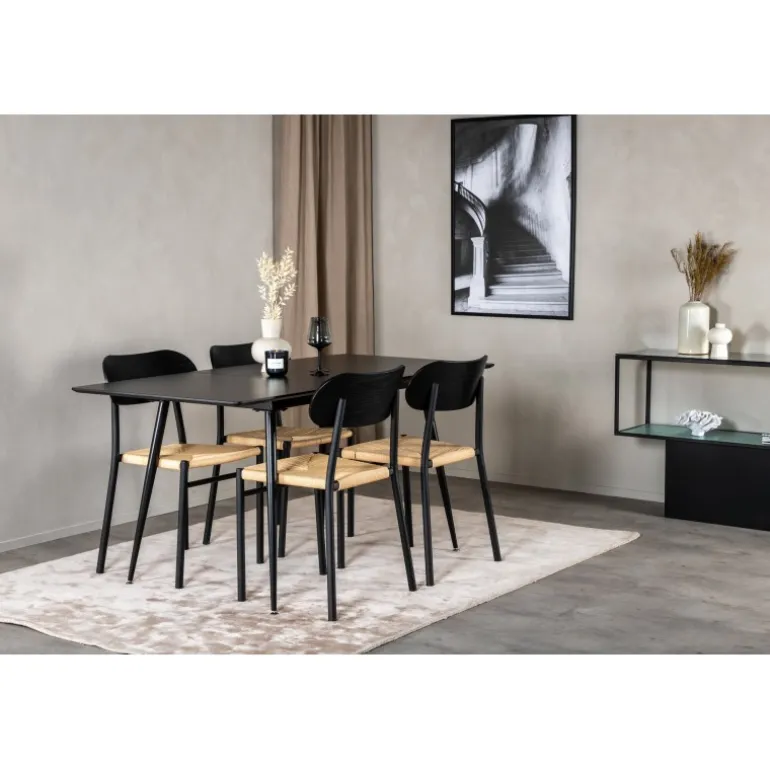 Oplev et moderne og stilfuldt Spisebordssæt til dit hjem med Spisebordssæt Silar med stole Polly. Dette sæt består af et elegant sort bord og matchende stole, som er den perfekte kombination til hjemmets hjerte. Spisebordet er lavet af MDF og stål, mens stolene er fremstillet af metal, krydsfiner og rattan, hvilket sikrer en holdbar og æstetisk tiltalende løsning. Sættet passer perfekt til dine behov og vil nemt kunne integreres med din øvrige indretning.