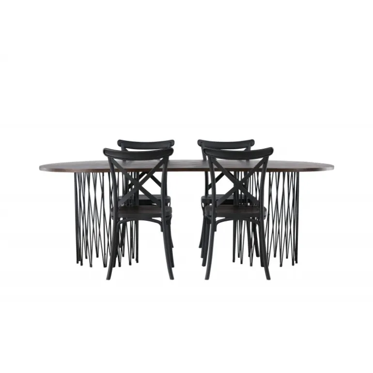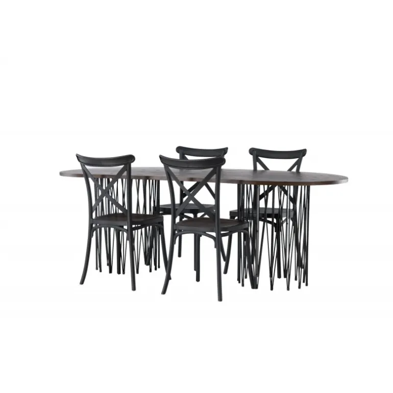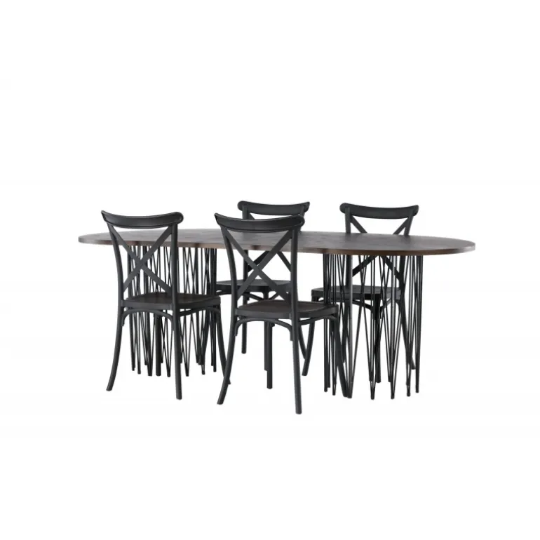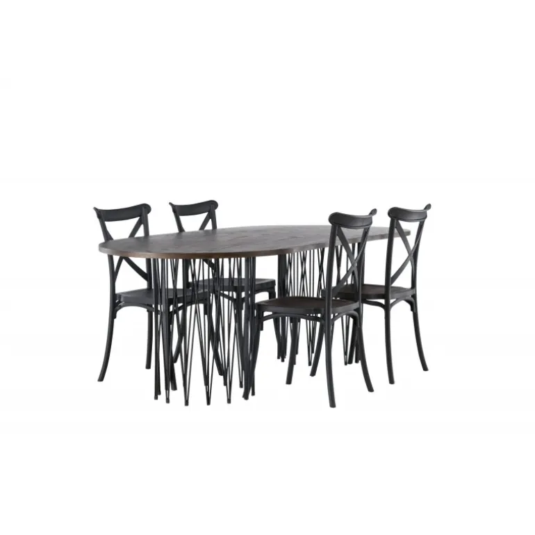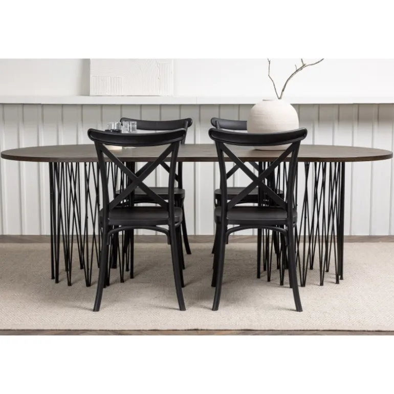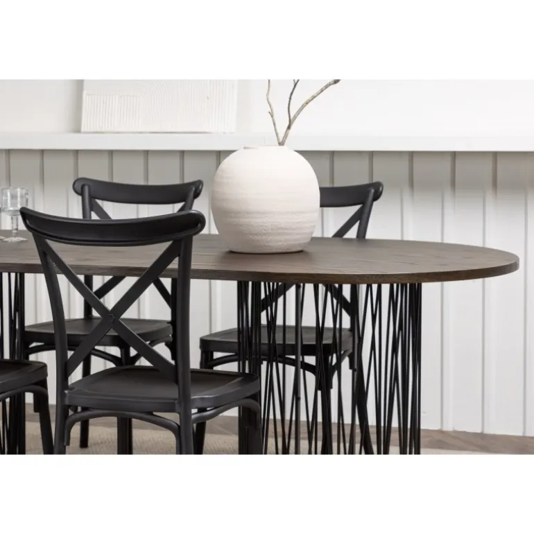 Indret dig storslået! Vores ovale spisebord Stone imponerer med sit modebevidste design. Bordet har en smuk brun bordplade i MDF med finer og to dekorative cylindriske rammer i sort metal. Her sammen med sorte spisebordsstole fra Crosett-serien. Stolen er konsekvent lavet af det praktiske materiale plastik og har en mat sort farve, der holder i tiden. Sæt tonen i stuen med en personlig Spisebordssæt! Bordets dimensioner: 220x100cm.