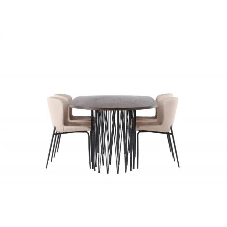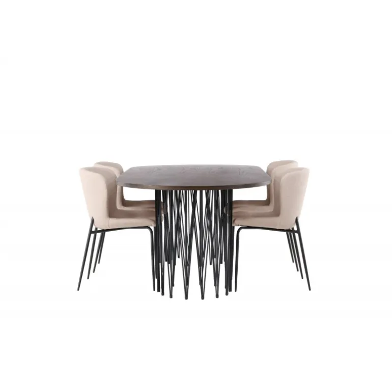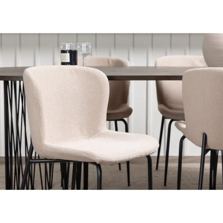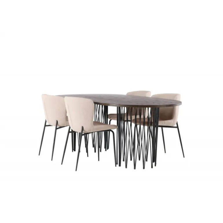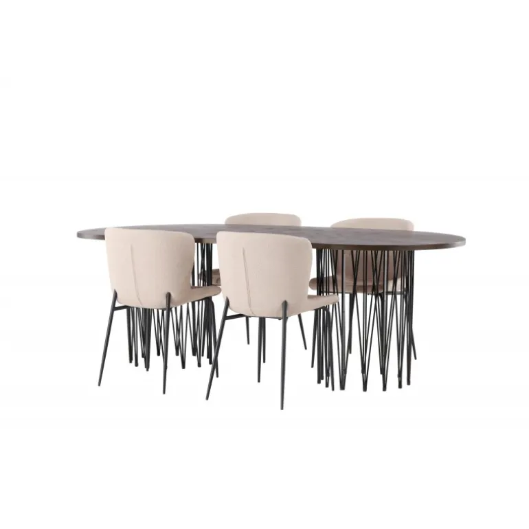 Velkommen hjem til et charmerende midtpunkt! Vores ovale spisebord Stone imponerer med sit modebevidste design. Bordet har en smuk brunfarvet bordplade i MDF med finer og to dekorative cylindriske rammer i sort metal. Her sammen med modebevidste spisestole fra Modesto-serien. Stolen er fuldt polstret i grå shaggy stof med stilfulde smalle stoleben i sort metal. Den let afrundede ryg og polstrede sædehynde giver ekstra komfort og forlænger hyggelige måltider omkring spisebordet. Sid behageligt med venner og familie! Bordmål: 220x100cm.
