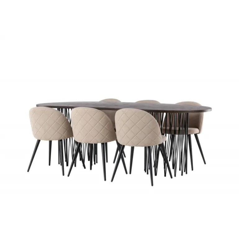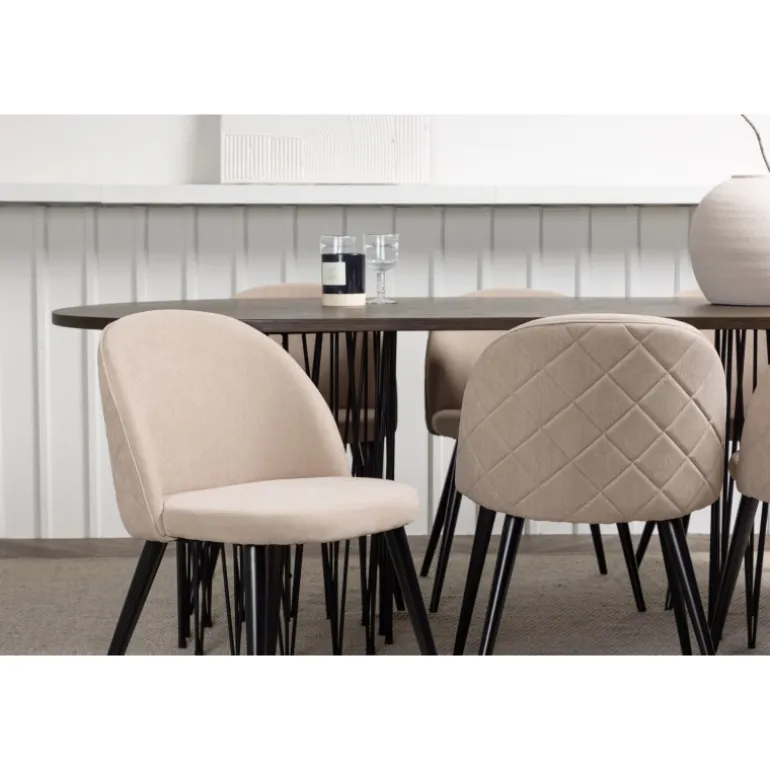 En vidunderlig kombination af høj komfort og moderne former! Vores ovale spisebord Stone imponerer med sit modebevidste design. Bordet har en smuk brun bordplade i MDF med finer og to dekorative cylindriske rammer i sort metal. Her i trendy kombination med spiseborde fra Velvet Stitches-serien. Stolens ryg er afrundet og, ligesom sædet, er den blødt polstret i beige polyesterlin med dekorative syninger og ternet mønster på bagsiden. Benene er let udadgående i sort jern. Indret dit hjem trend-sikkert! Bordmål: 220×100 cm.