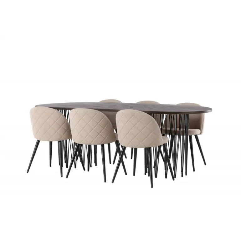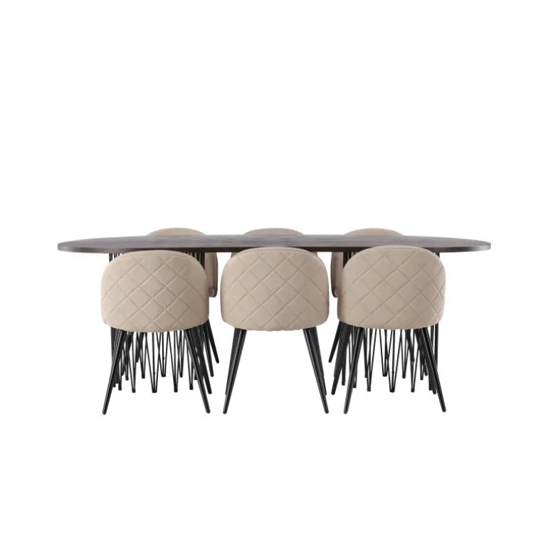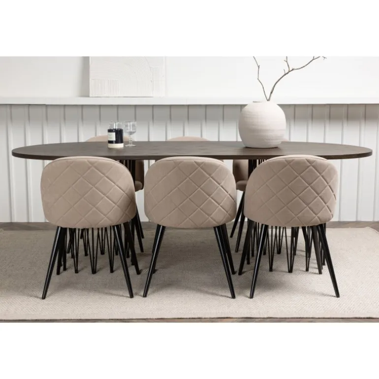 - Moderne design: Spisebord Stone med ovalt design og trendy Velvet stole.