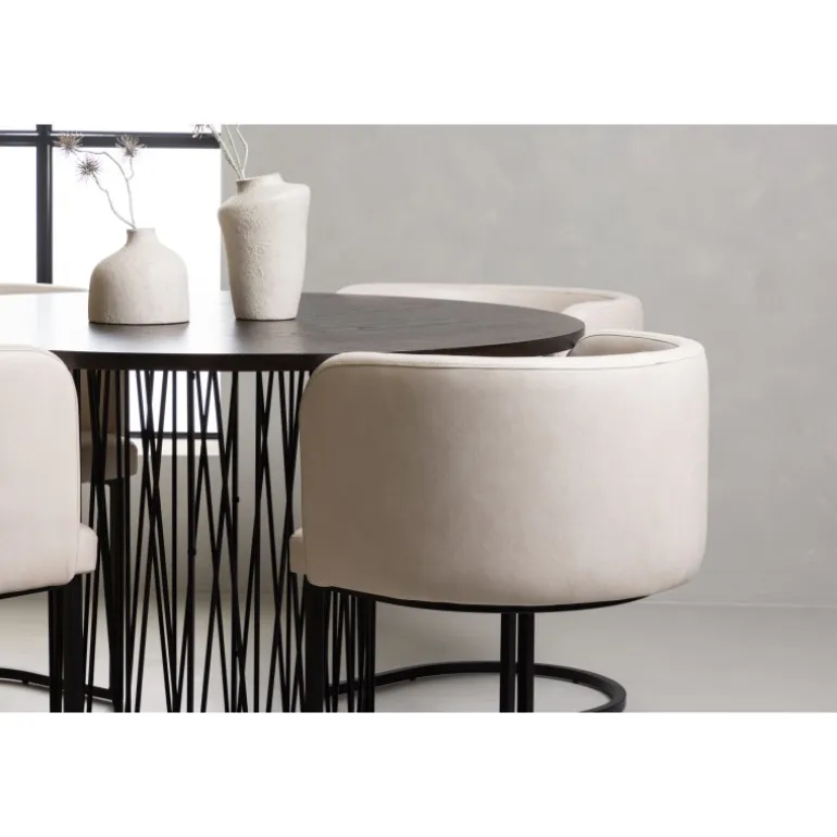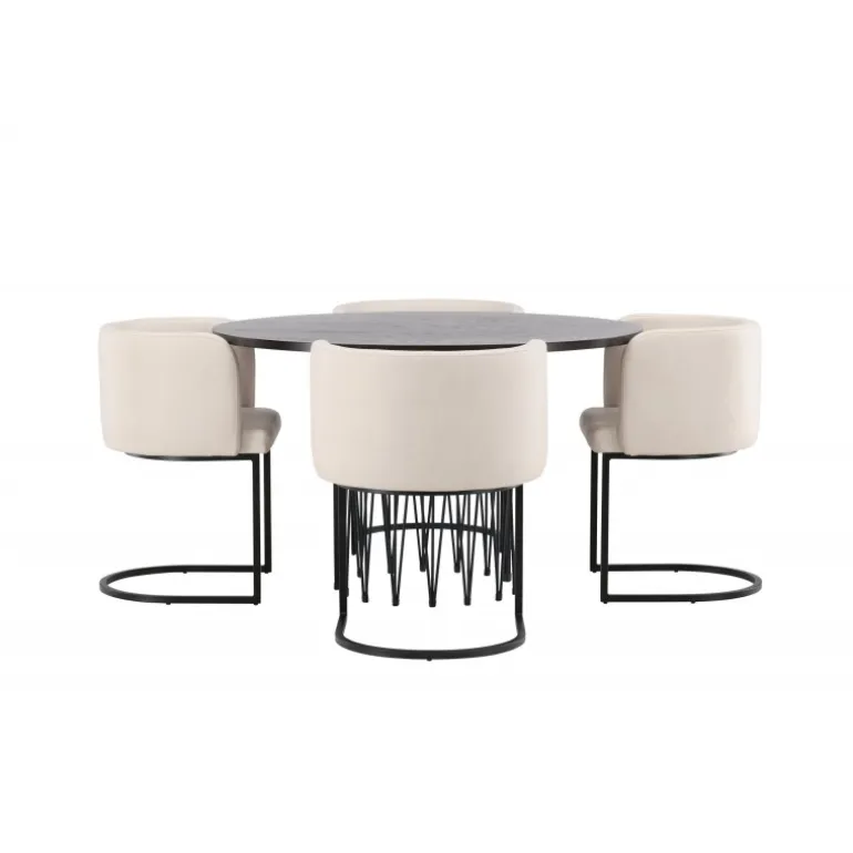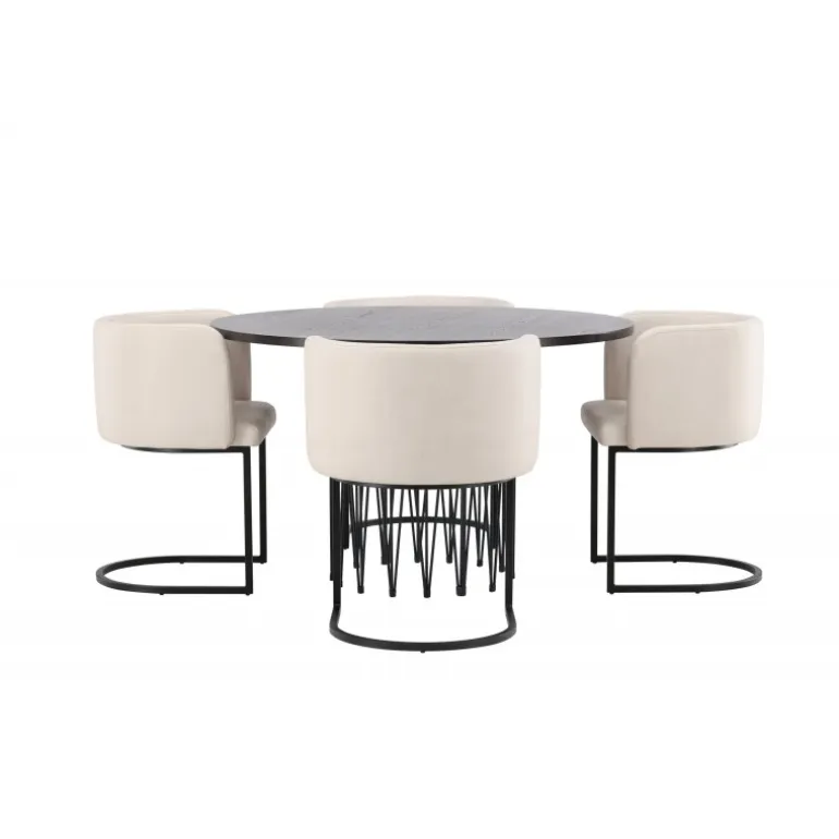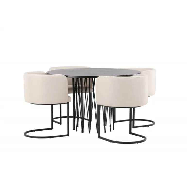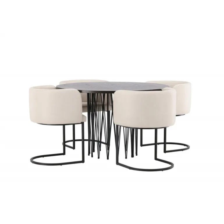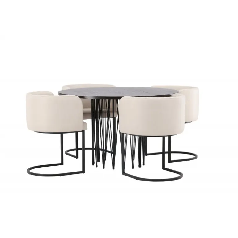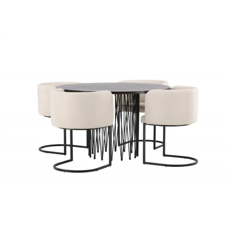 Dette spisebordssæt udstråler elegance og bekvemmelighed! Det runde spisebord Stone imponerer med sit modebevidste design og smukke brune MDF-bordplade med finer og en dekorativ cylindrisk base i sort metal. Her sammen med vores elegante spisebordsstole fra Simrishamn-serien. Stolen har et fuldt polstret sæde med en rundet ryg i beige TC-stof og en dekorativ, minimalistisk benstruktur i sort stål. Det skal føles luksuriøst at komme hjem! Bordets diameter: 120 cm.
