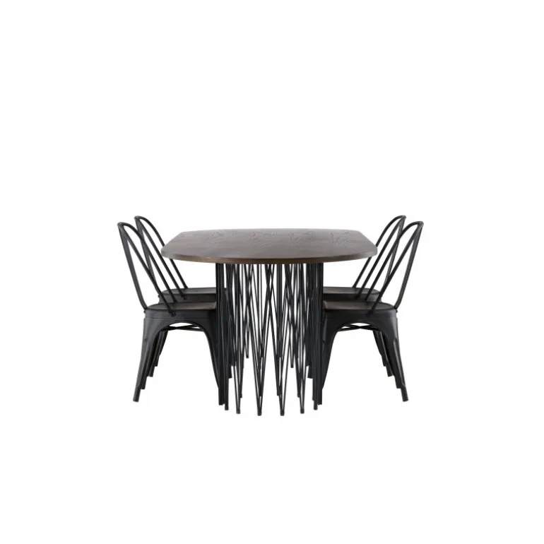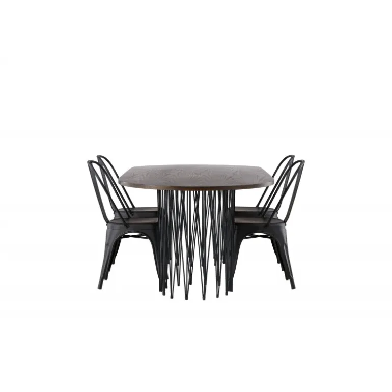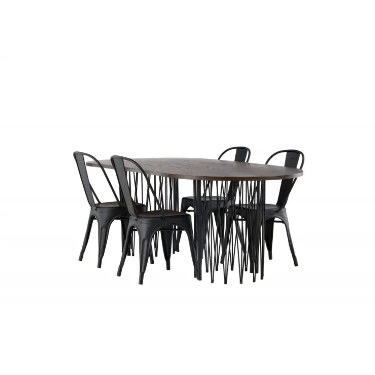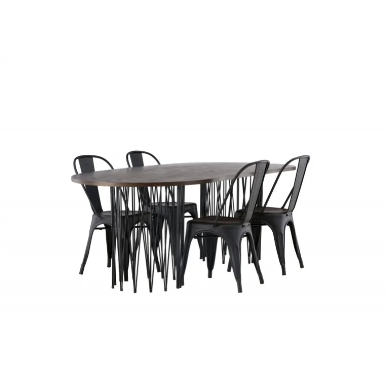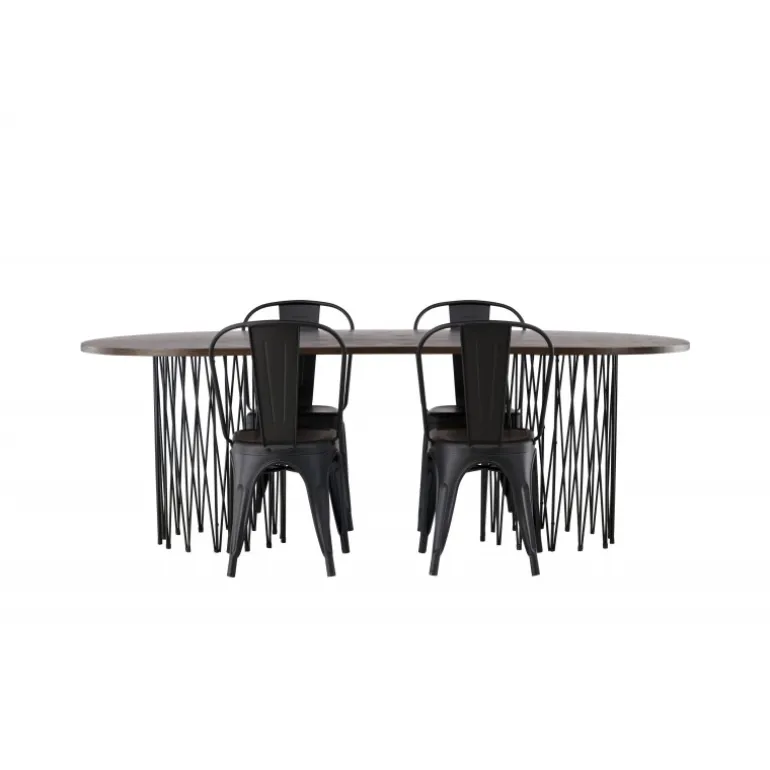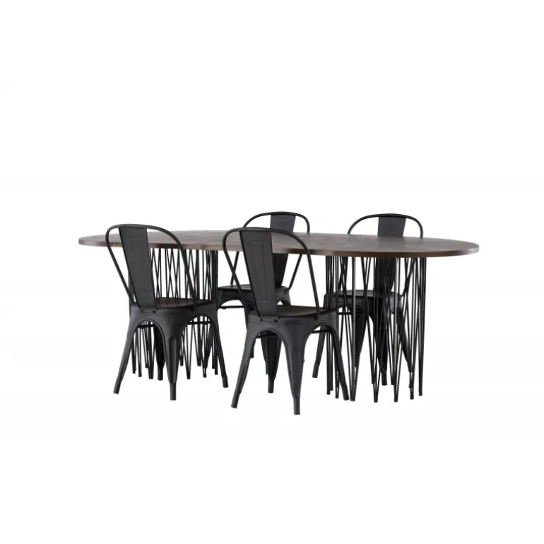 Som smart som det er stilfuldt! Vores ovale spisebord Stone imponerer med sit modebevidste design. Bordet har en smuk brunfarvet bordplade i MDF med finer og to dekorative cylindriske rammer i sort metal. Her sammen med vores sorte spisebordsstole fra Tempe-serien. Stolen har let udadvendte ben, der glat møder sædet og ryglænet i et stilfuldt design, lavet af sort metal hele vejen igennem. Kort sagt, en storslået Spisebordssæt! Bordmål: 220x100cm.