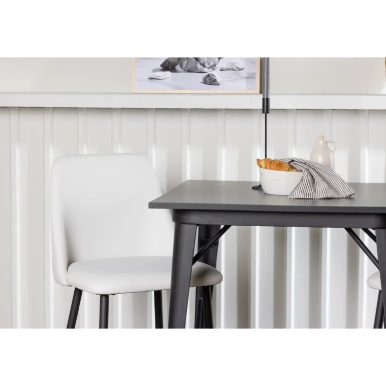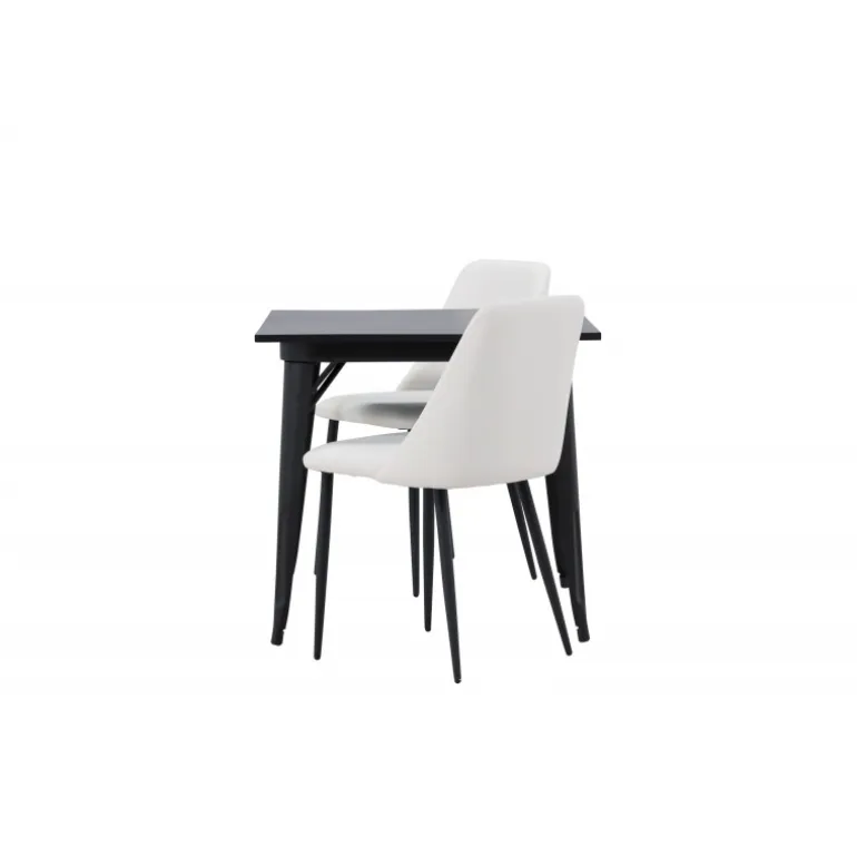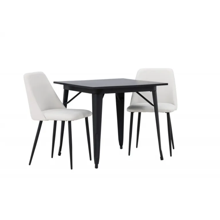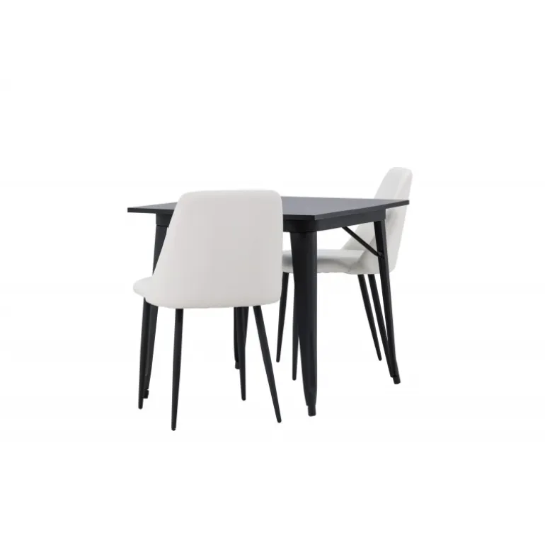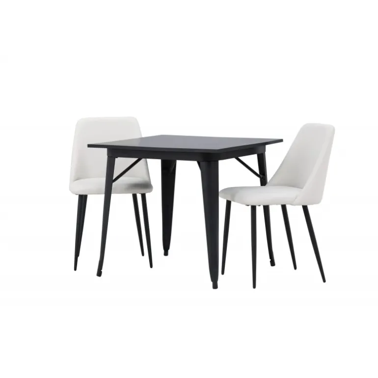 En charmerende Spisebordssæt til to! Vores kvadratiske spisebord Tempe har en kompakt størrelse og trendy, skandinavisk design. Lavet med en bordplade i sort MDF og bordben i sort metal. Her i en stilfuld kombination med hvide spisebordsstole fra serien Night. Stolen har et fuldt polstret sæde i hvid PU, der føles lige så luksuriøst som elegant, og benene er i sort stål. Sædet er også polstret for ekstra komfort. Her får du den perfekte kombination! Bordmål: 80×80 cm.