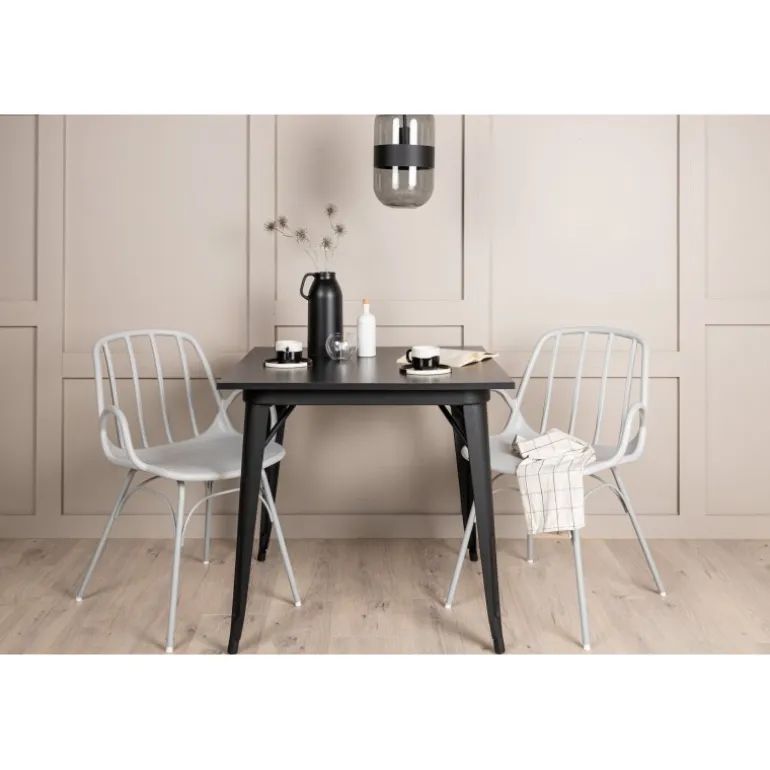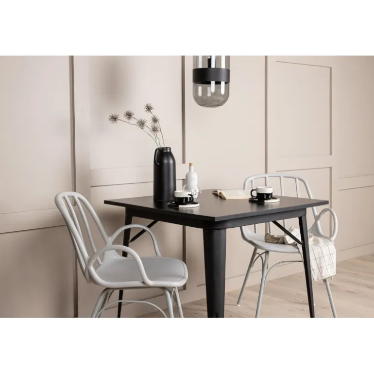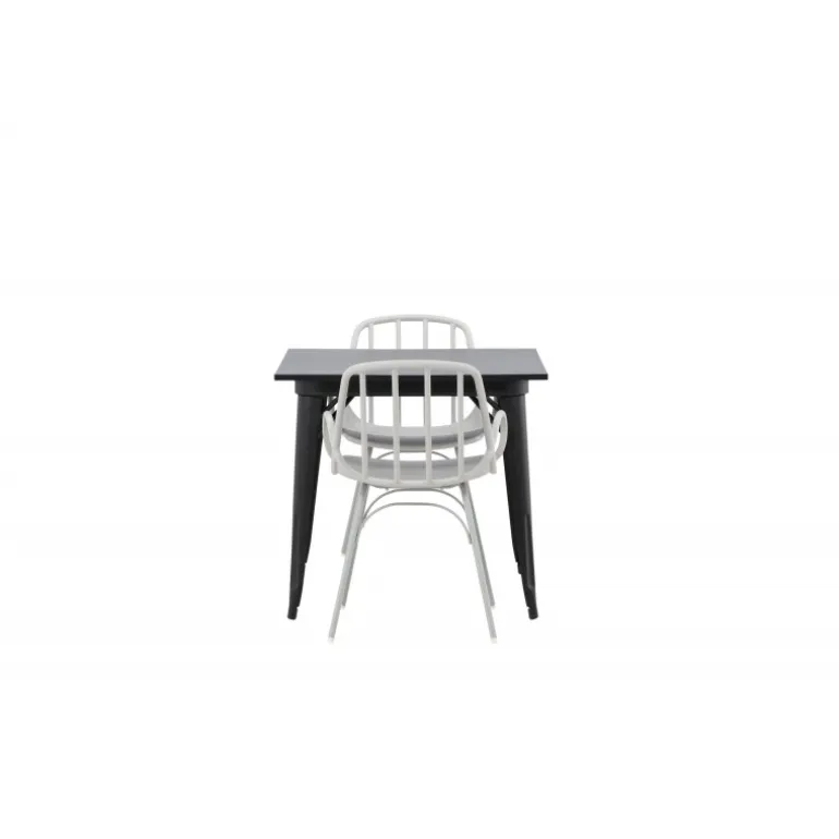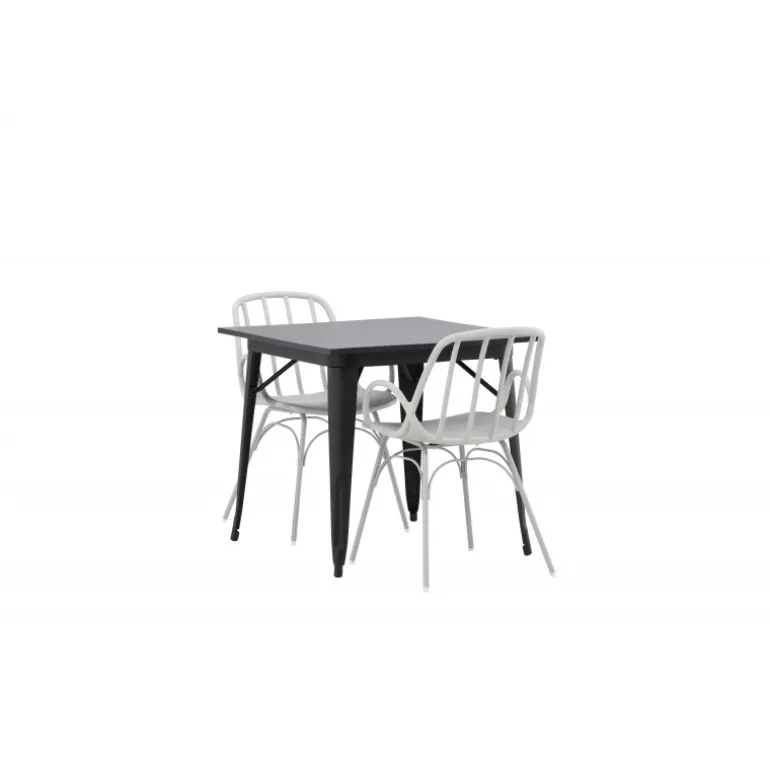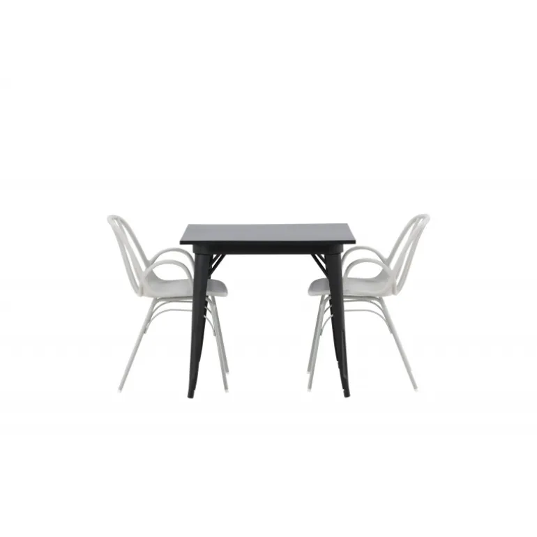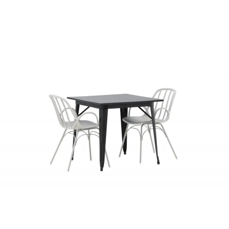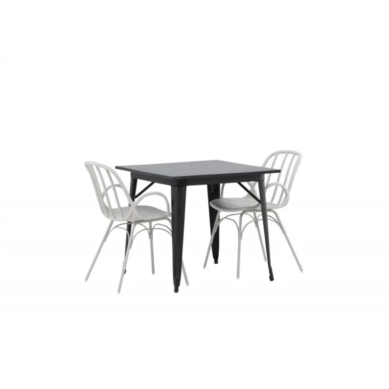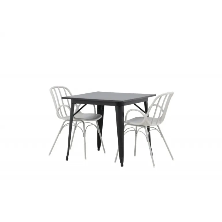 Indret smart og indbydende med et trendy Spisebordssæt! Tempe spisebord har et skandinavisk design med lige nordiske former, der holder over tid. Fremstillet med en firkantet bordplade i sort MDF og bordben i sort metal. Her sammen med 2 spisestole fra serien Dyron. Stolen er lige så stilfuld som praktisk, lavet af beige plast og stål. Stolen har integrerede armlæn og et ribbet design i den let afrundede ryg. Et perfekt Spisebordssæt til det mindre køkken!