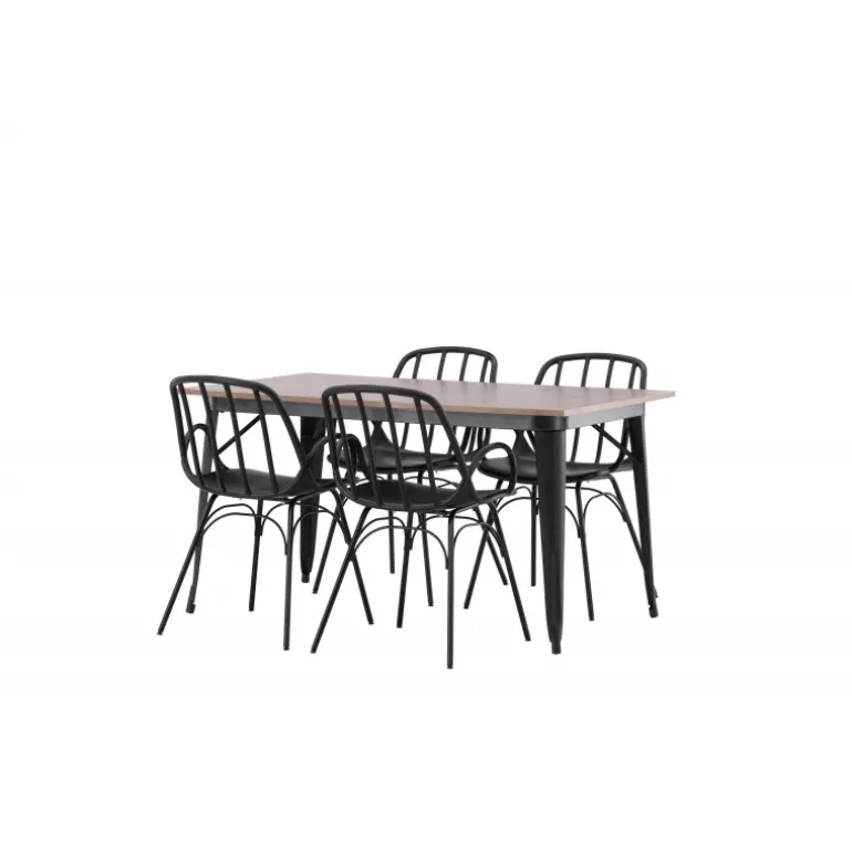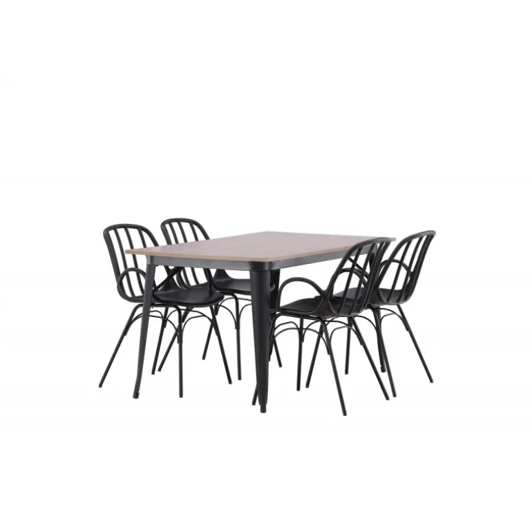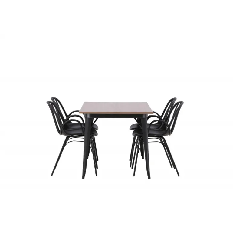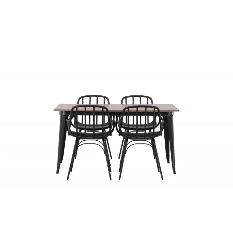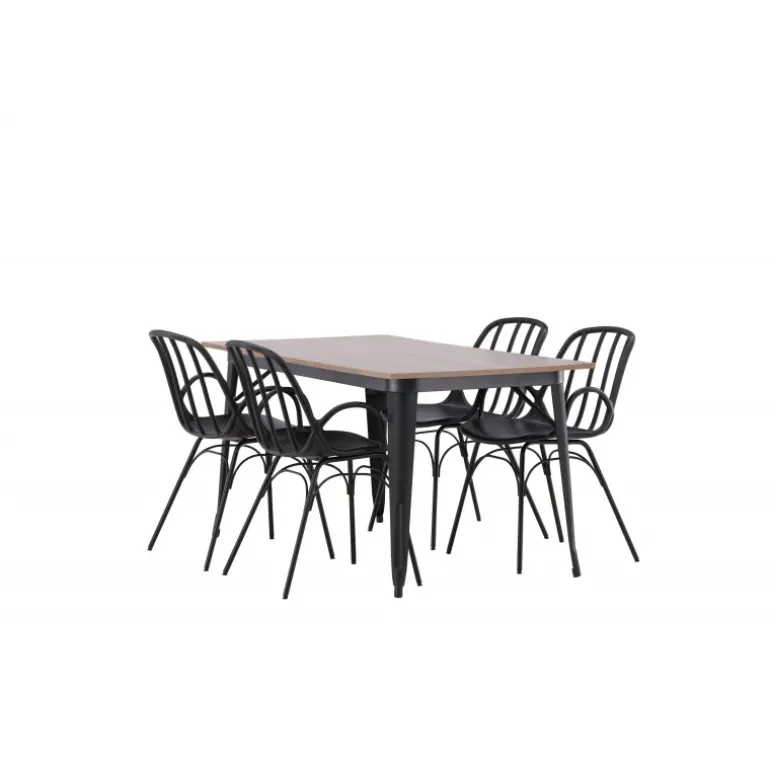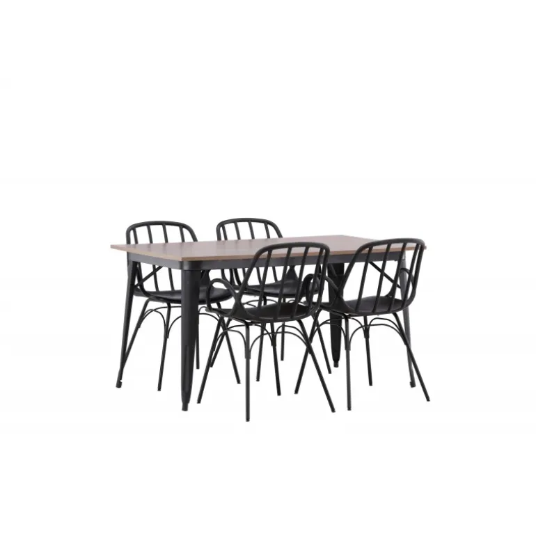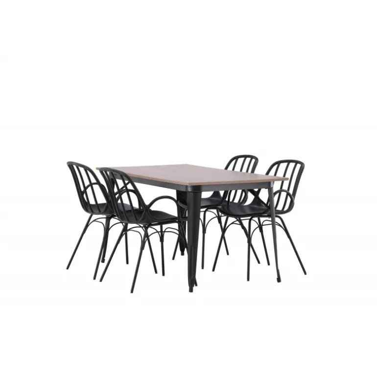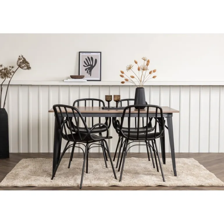 Et Spisebordssæt, der udstråler modernitet og nordisk design! Spisebordet fra Tempe-serien er både tidløst og holdbart. Lavet med en rektangulær bordplade i brun MDF og bordben i sort metal. Her sammen med vores populære spisestole fra serien Dyron. Stolen er lige så stilfuld som praktisk, lavet af sort plastik og stål. Sædet har integrerede armlæn og et ribbet design i den let afrundede ryg. Møbler hjertet af hjemmet indbydende og skab en behagelig atmosfære!