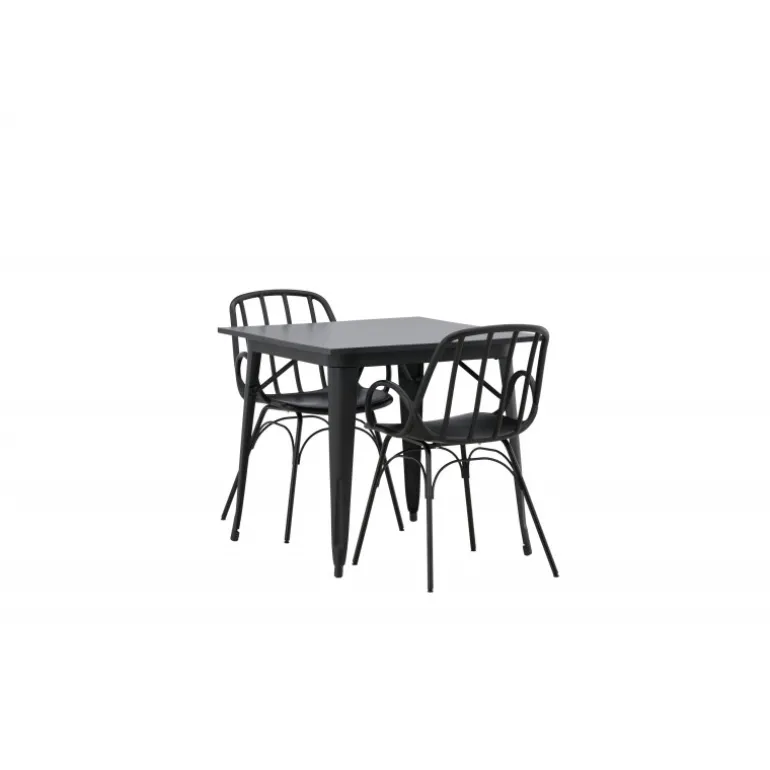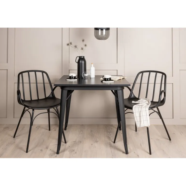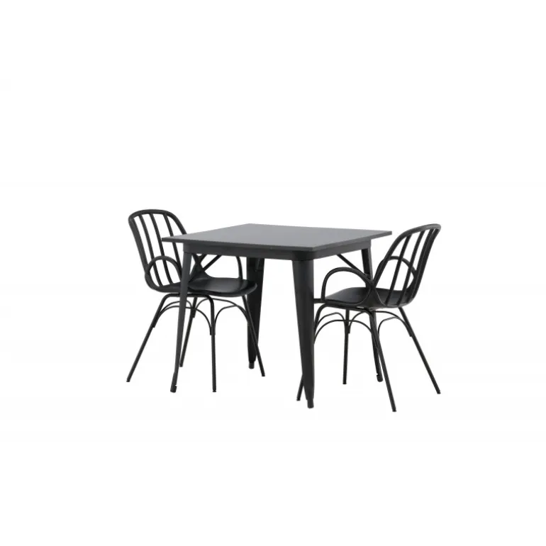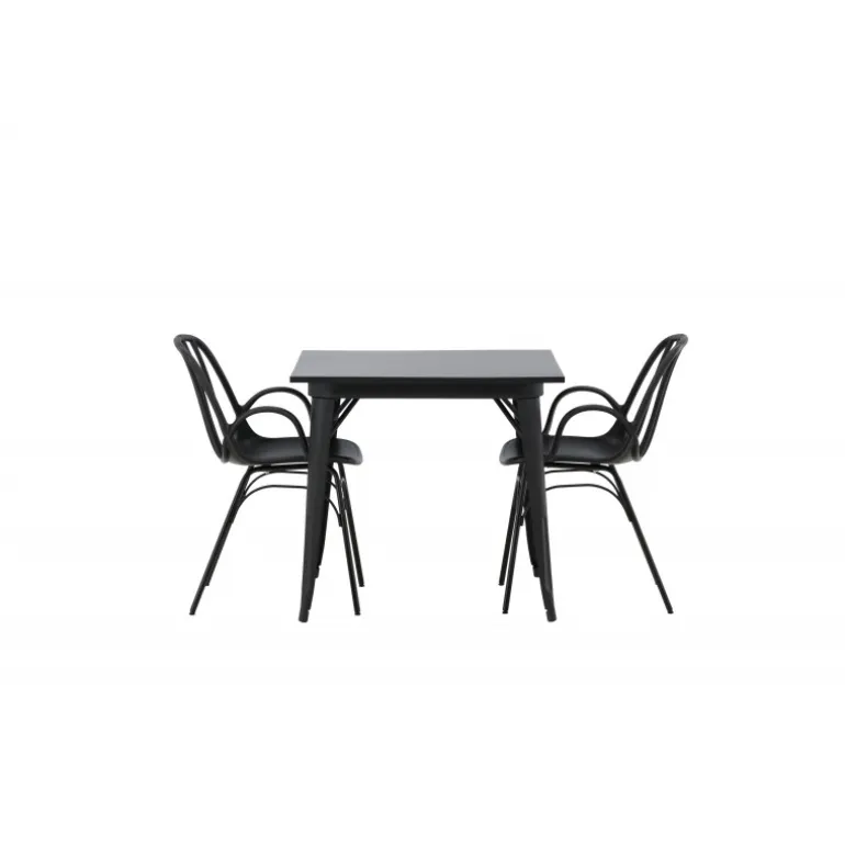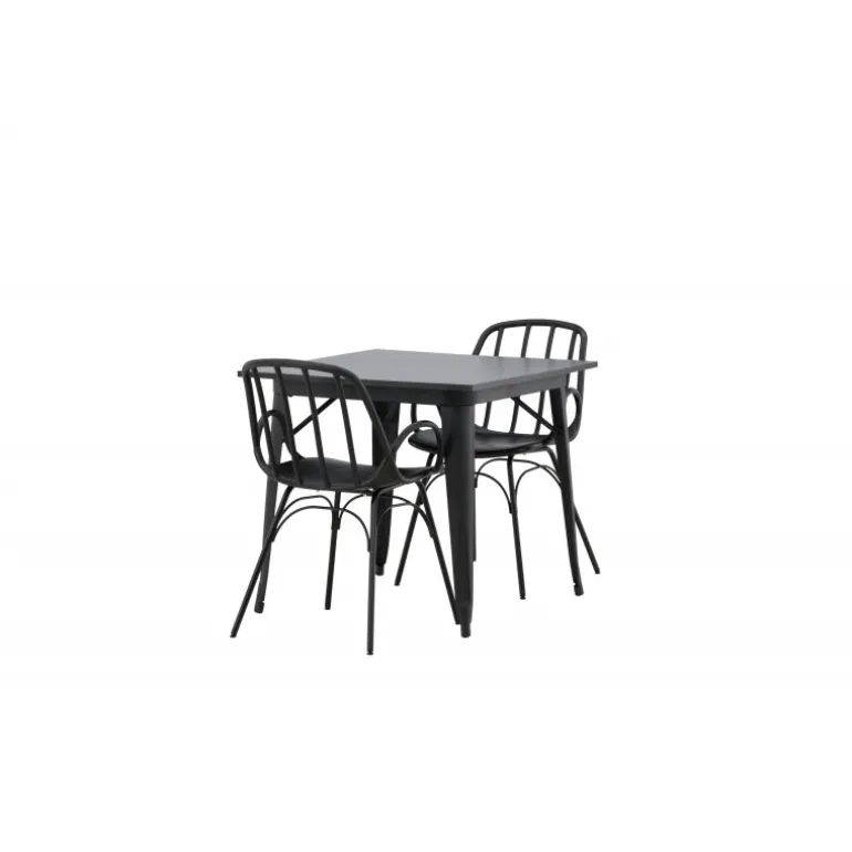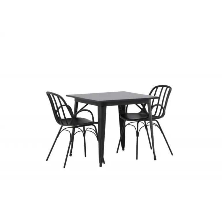 Et perfekt Spisebordssæt til det mindre køkken! Tempe spisebordet har et skandinavisk design med lige, nordiske former, der står tidens prøve. Lavet med en kvadratisk bordplade i sort MDF og bordben i sort metal. Her sammen med 2 spisebordsstole fra serien Dyron. Stolen er lige så stilfuld som den er praktisk, lavet af sort plastik og stål. Stolen har integrerede armlæn og et ribbet design i den let afrundede ryg. Indret smart og indbydende med et trendy sort Spisebordssæt!