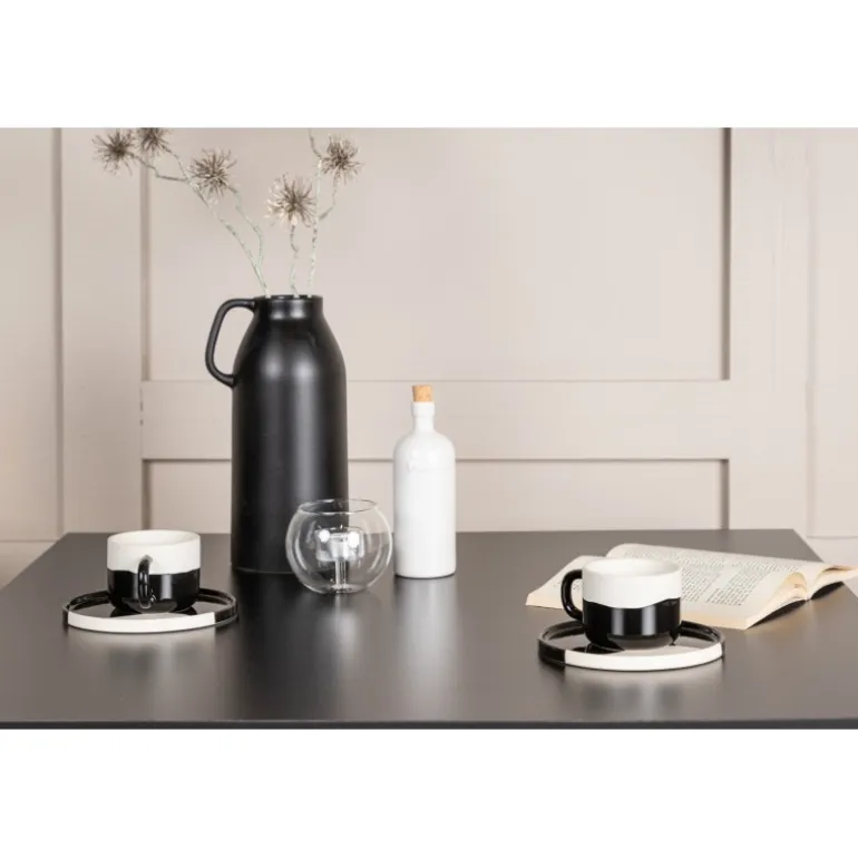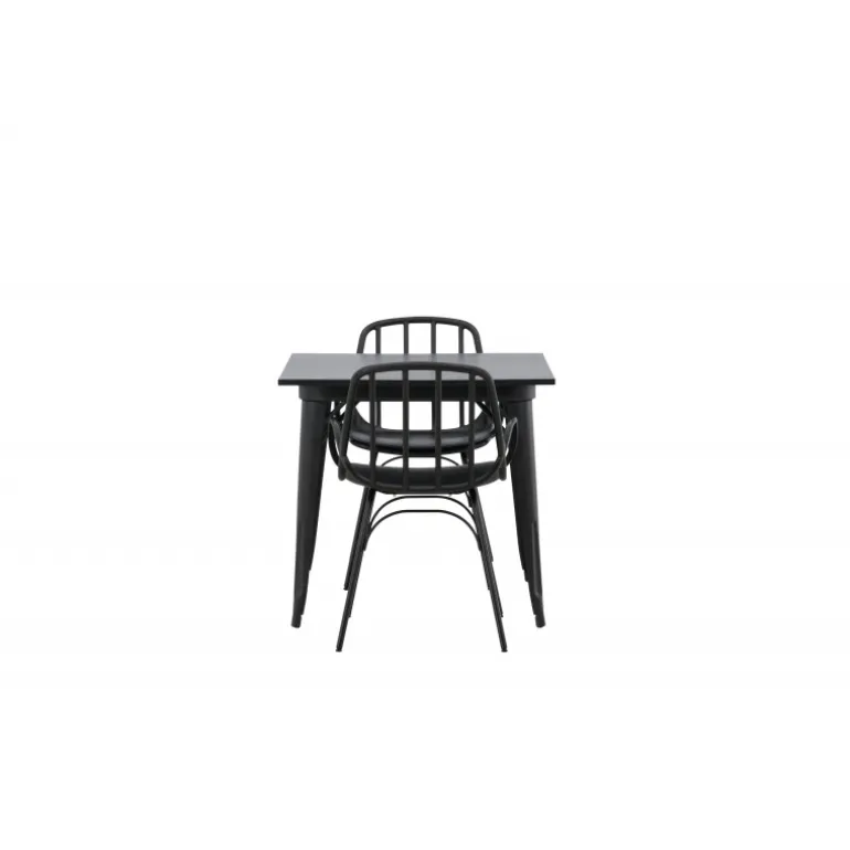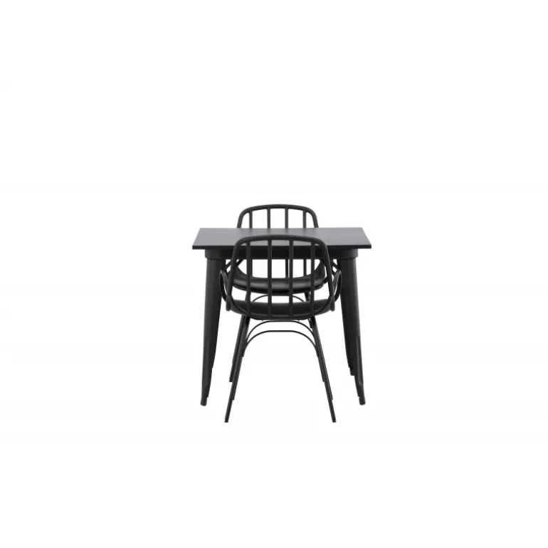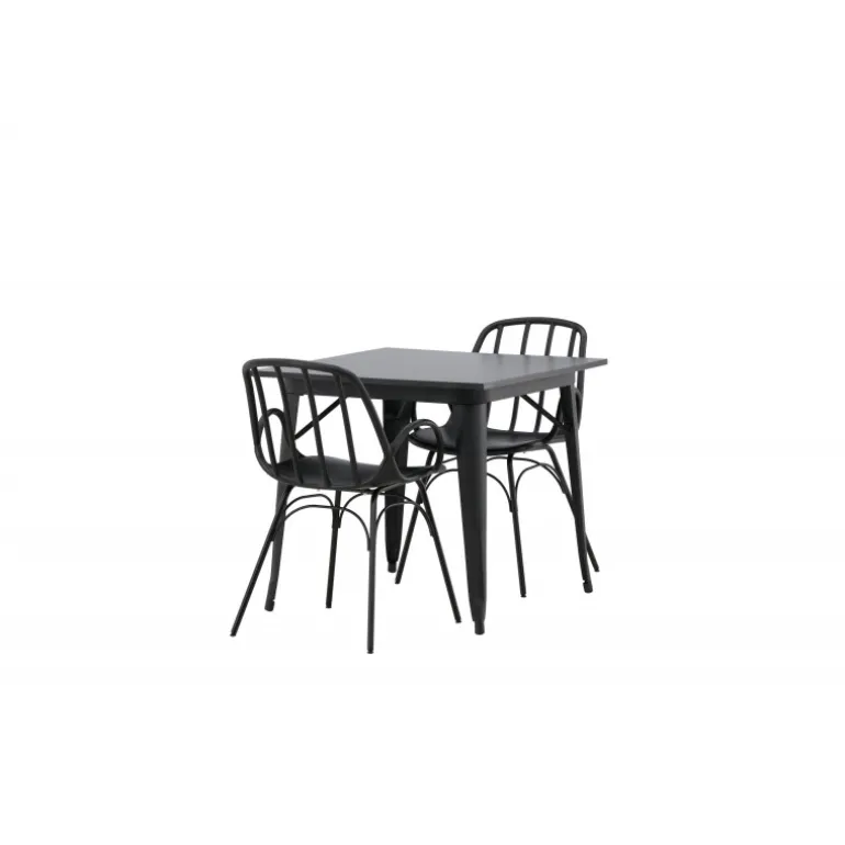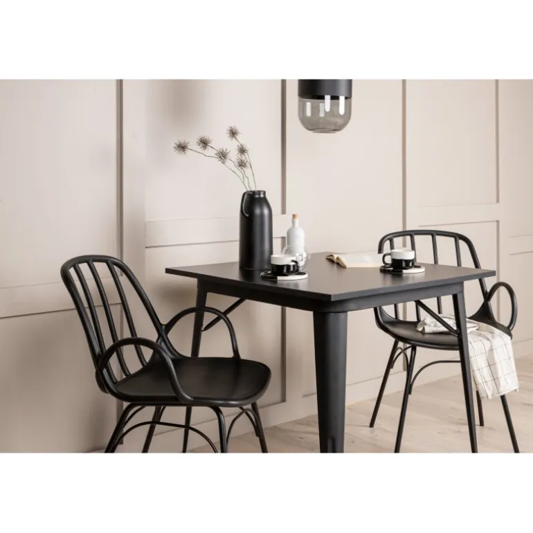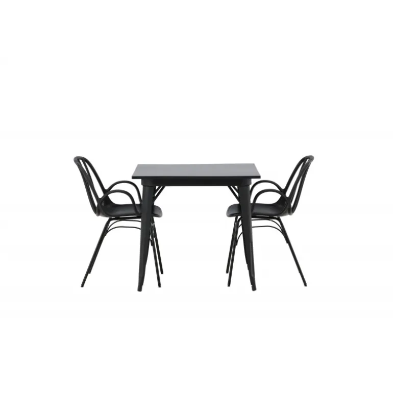 Et perfekt Spisebordssæt til det mindre køkken! Tempe spisebordet har et skandinavisk design med lige, nordiske former, der står tidens prøve. Lavet med en kvadratisk bordplade i sort MDF og bordben i sort metal. Her sammen med 2 spisebordsstole fra serien Dyron. Stolen er lige så stilfuld som den er praktisk, lavet af sort plastik og stål. Stolen har integrerede armlæn og et ribbet design i den let afrundede ryg. Indret smart og indbydende med et trendy sort Spisebordssæt!