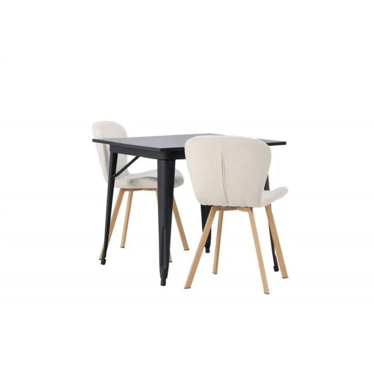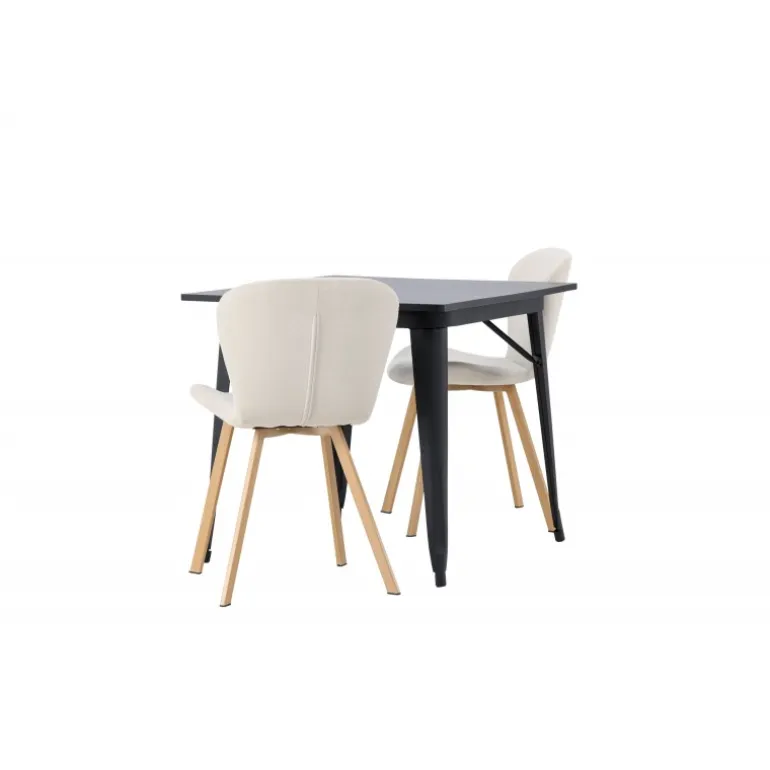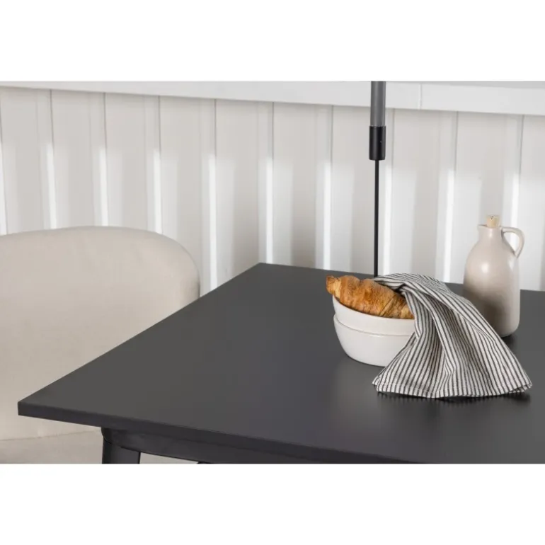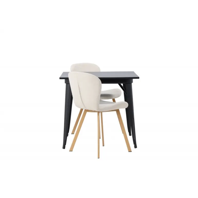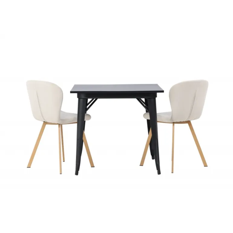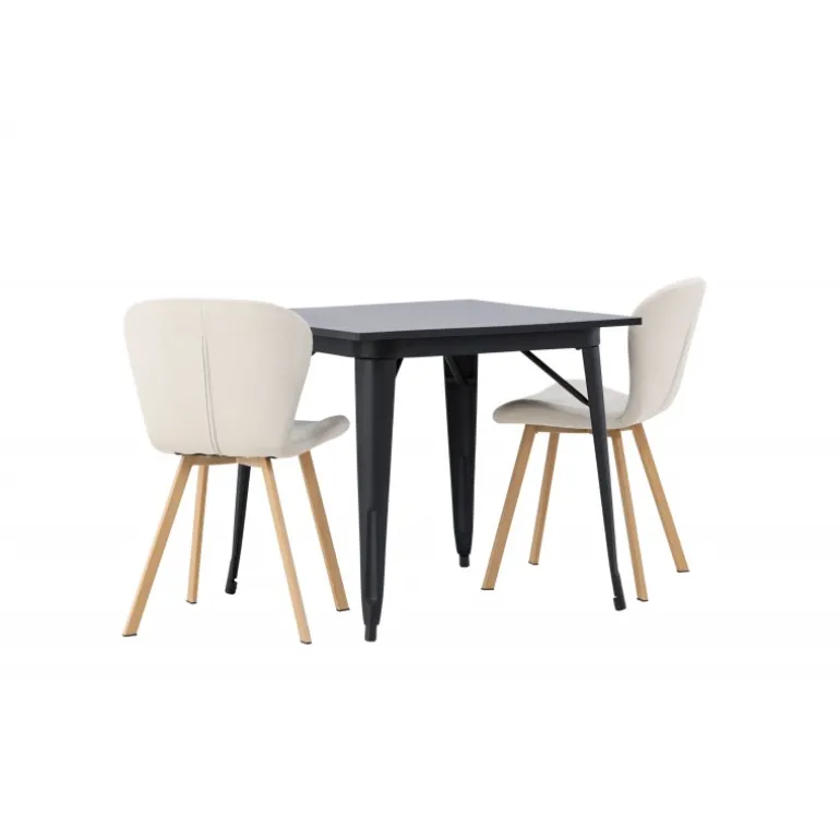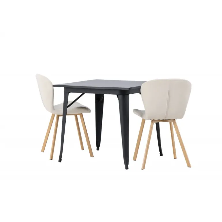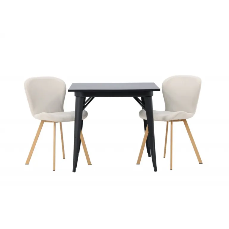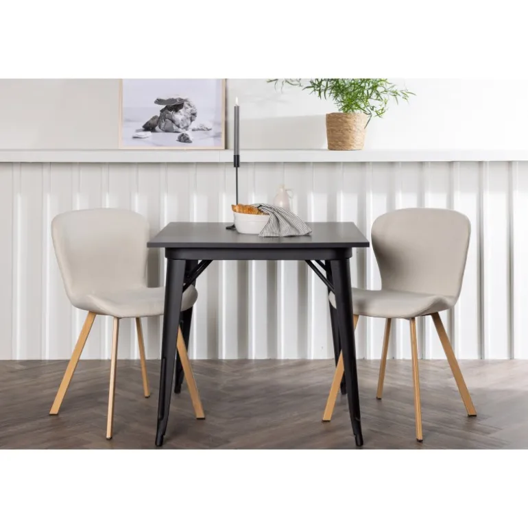 Moderne former og stilfuldt design! Vores kvadratiske spisebord Tempe har en kompakt størrelse og trendy, skandinavisk design. Lavet med en bordplade i sort MDF og bordben i sort metal. Her i vidunderlig kombination med beige spisestole fra Lilja-serien. Stolen har et bøjeligt rundt design med sæde i beige polyesterstof og let udadgående stoleben i sort metal. Den varme farve skaber en behagelig atmosfære! Bordmål: 80x80cm.