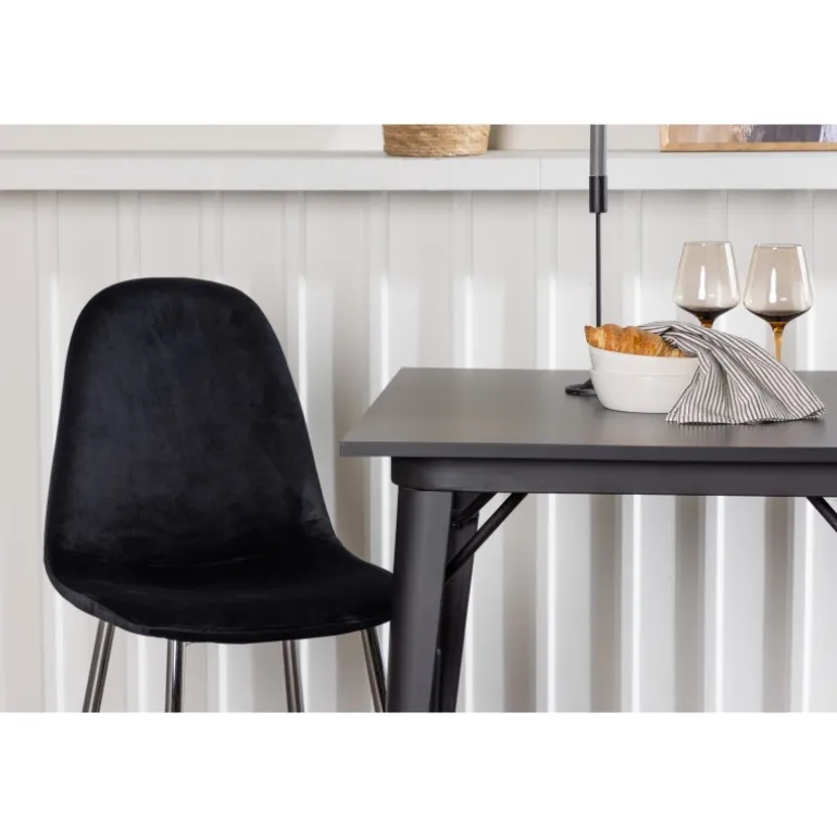 - Komfortable stole: Polstret med blødt sort fløjlstof og ben i kromet metal.