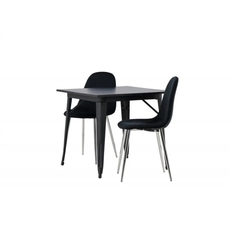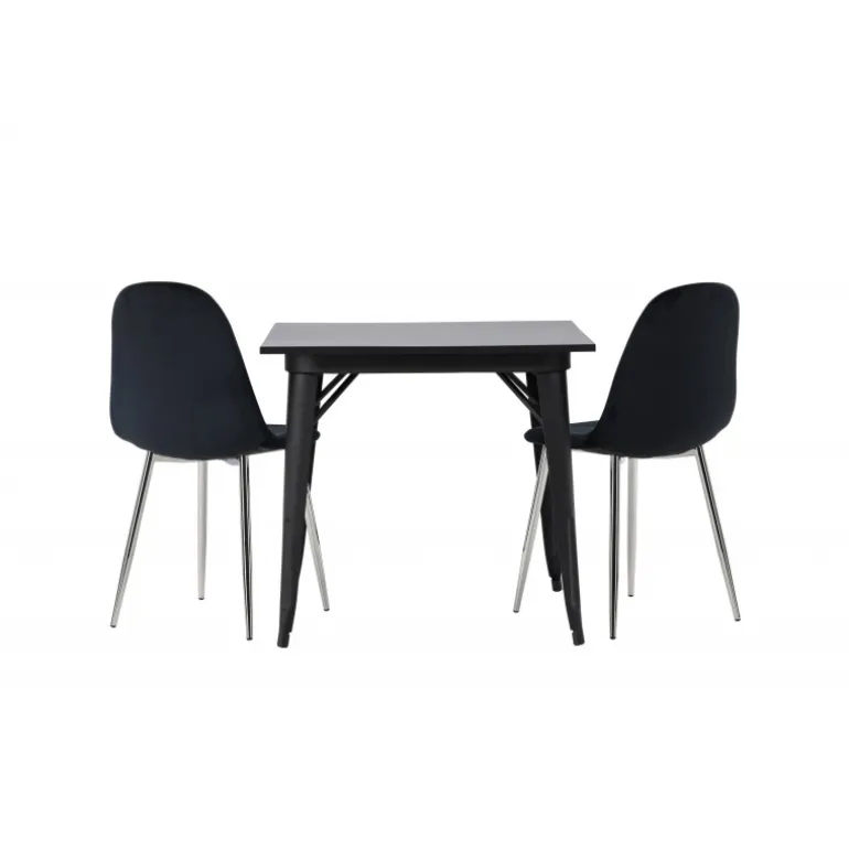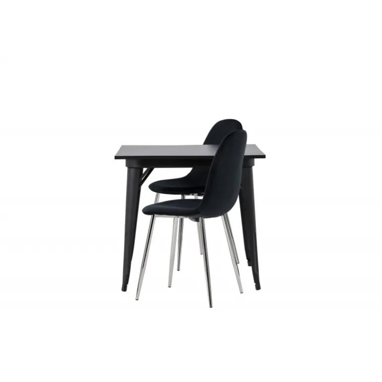 Sid behageligt i vores fantastiske Spisebordssæt til to! Vores firkantede spisebord Tempe har en kompakt størrelse og trendy, skandinavisk design. Bordet er lavet med en bordplade i sort MDF og bordben i sort metal. Her i en moderne kombination med sorte spisebordsstole fra Polar-serien. Stolen har et fuldt polstret design med ben i kromet metal, en let rundet ryg og sæde i elegant sort fløjlstof med blød polstring for ekstra komfort. Lige så stilfuld som den er komfortabel! Bordets dimensioner: 80×80 cm.