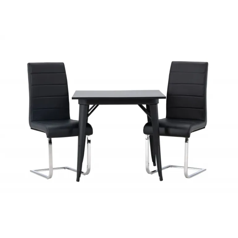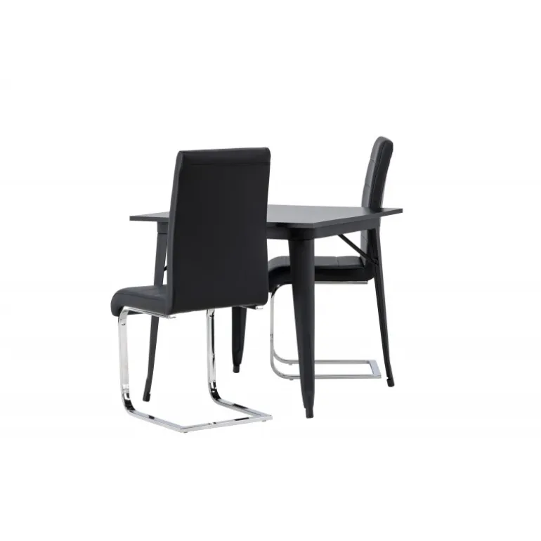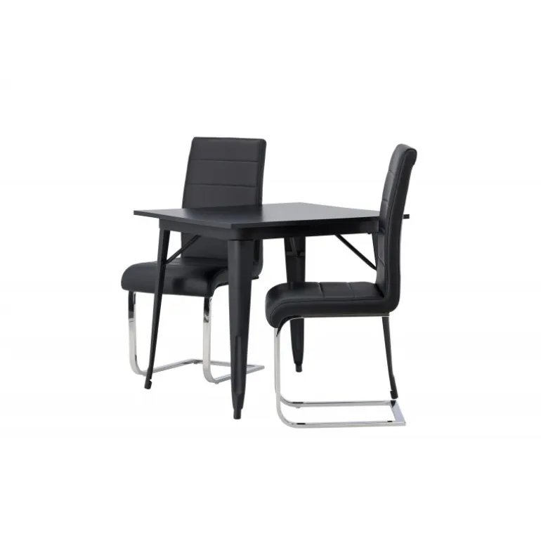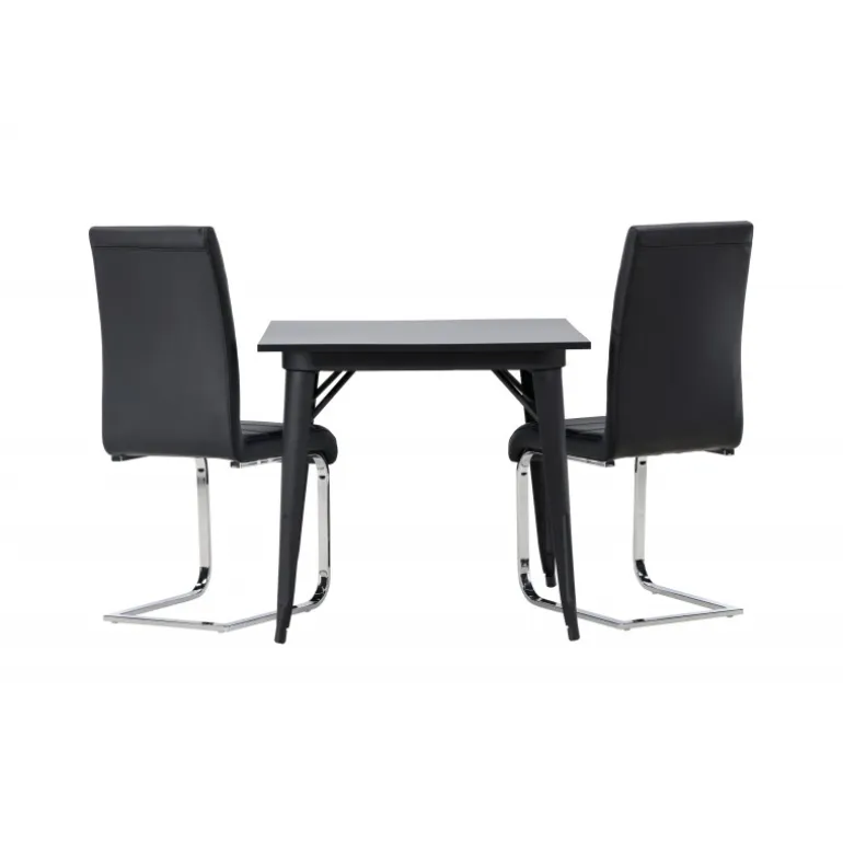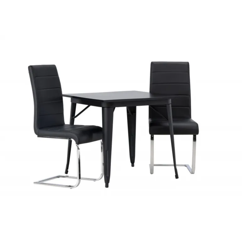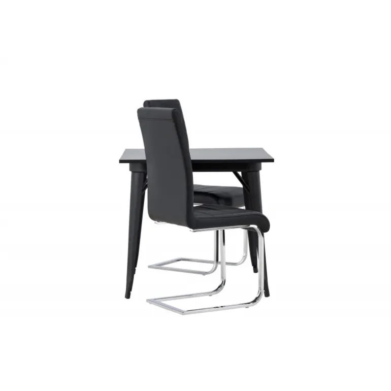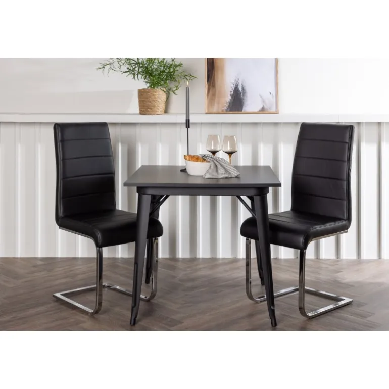 Skab den komfortable kontorstil i køkkenet! Vores kvadratiske spisebord Tempe har en kompakt størrelse og trendy, skandinavisk design. Lavet med en bordplade i sort MDF og bordben i sort metal. Her sammen med vores flotte, sorte spisestole fra Tempo-serien. Stolen har en lige ryg i sort PU med dekorative syninger og benene er dekorative i krommetal. Denne gruppe kombinerer industriel design med stramme nordiske former! Bordmål: 80×80 cm.