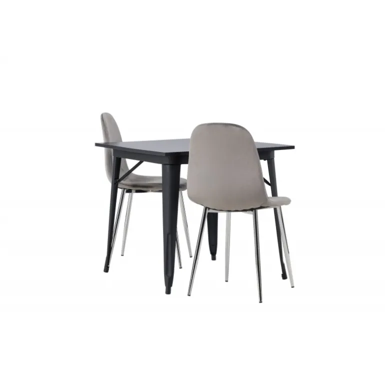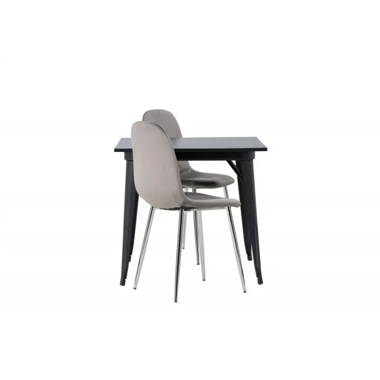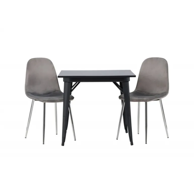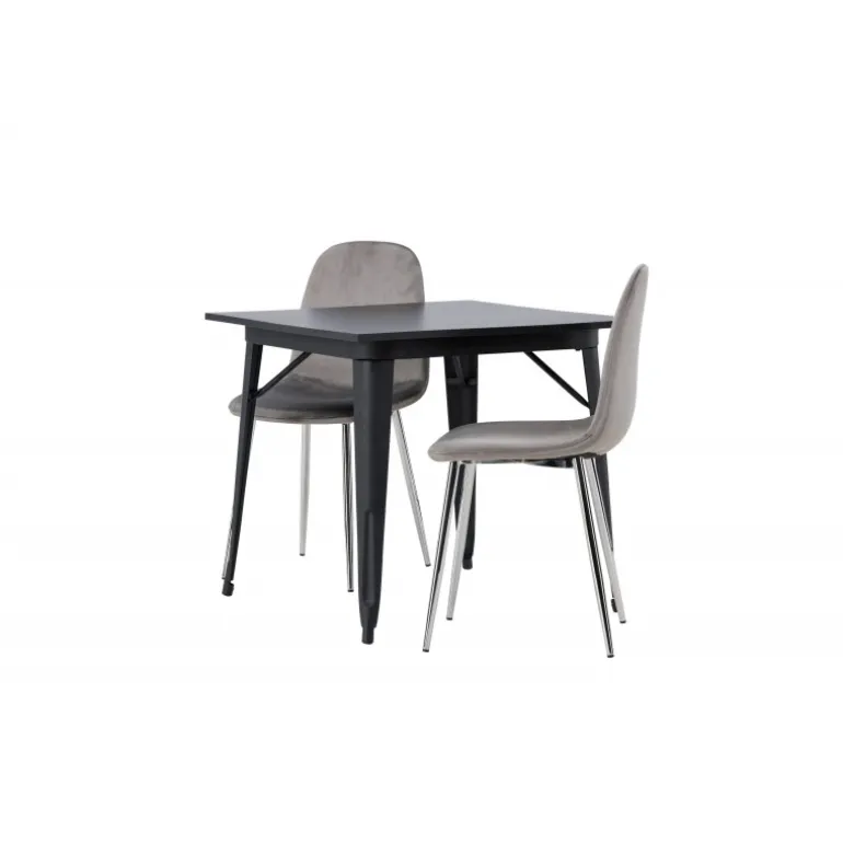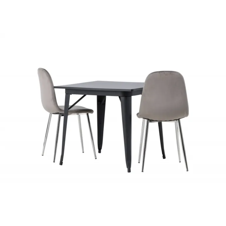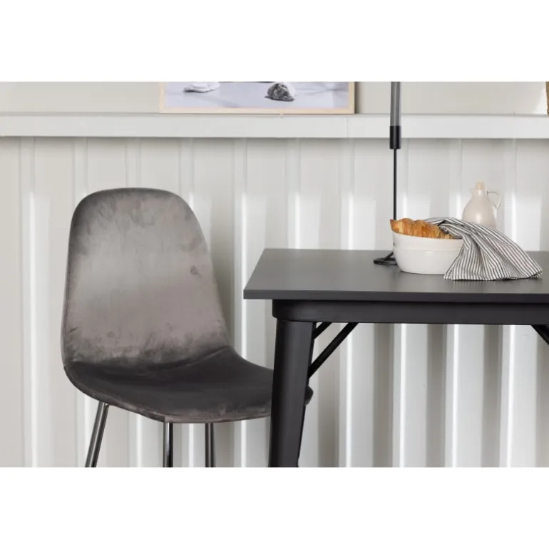 Indret med behagelige farver! Vores kvadratiske spisebord Tempe har en pæn størrelse og trendy, skandinavisk design. Lavet med en bordplade i sort MDF og bordben i sort metal. Her i en moderne kombination med grå spisestole fra Eva-serien. Stolen har et fuldt polstret design med ben i krommetal, en let rundet ryg og sæde i slankt gråt velourstof med blød polstring for ekstra komfort. Her får du en fløjlsagtig blikfang! Bordets dimensioner: 80x80cm.
