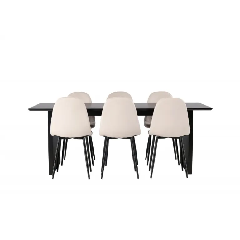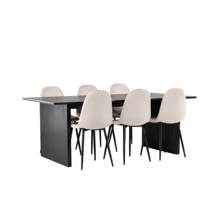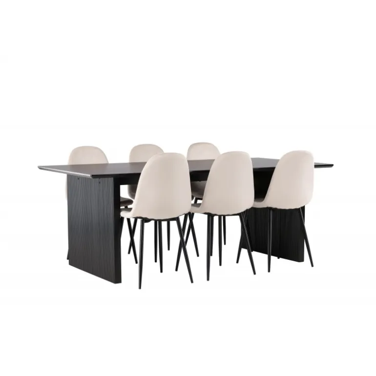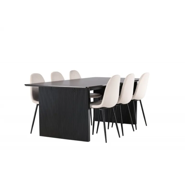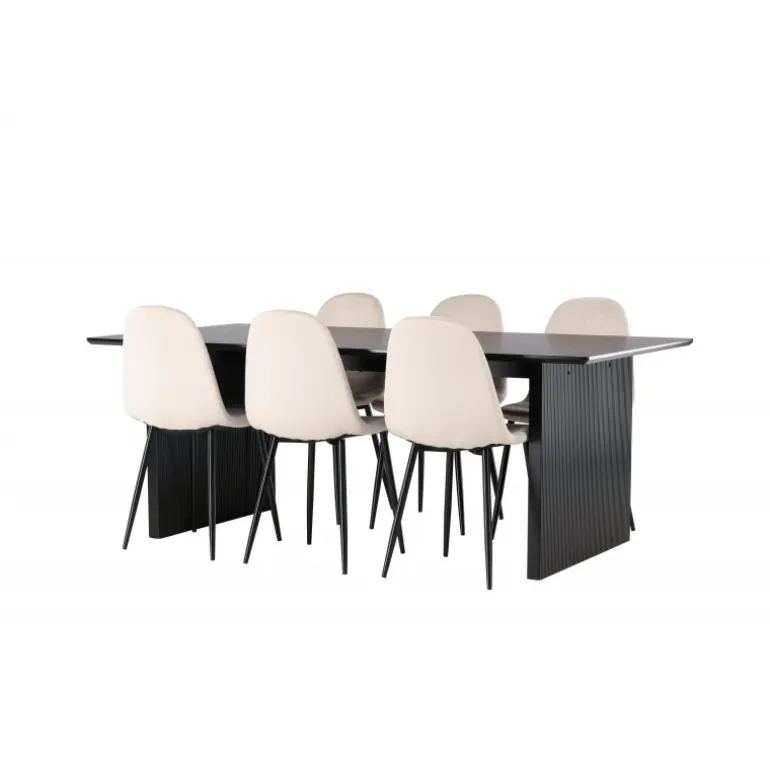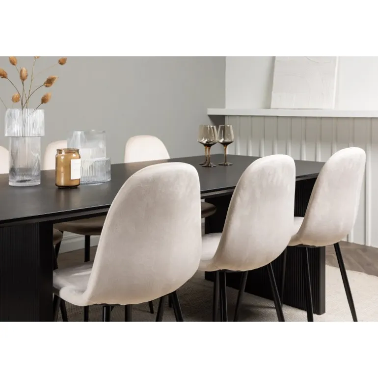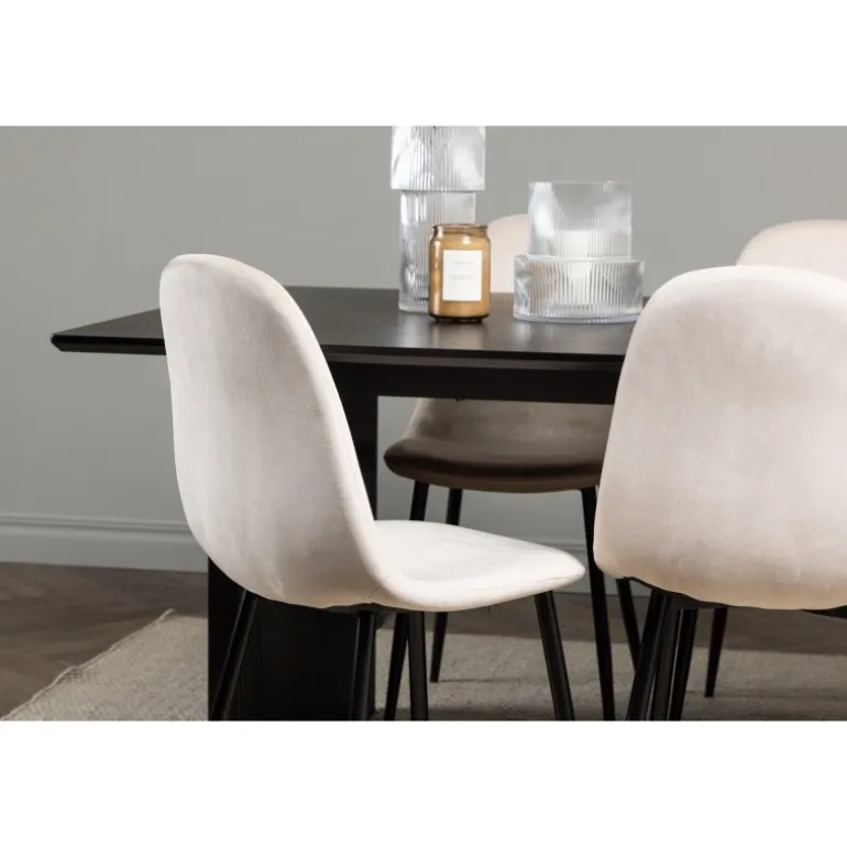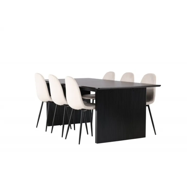 Et elegant og strålende Spisebordssæt! Det rektangulære spisebord Vail har lige nordiske former og er lavet af holdbart MDF i en sodsort farve. Bordpladen er tynd i et rektangulært design og balancerer på to robuste træplader, der udgør basen. Her sammen med vores vidunderlige spisebordsstole Polar. Denne spisebordsstol er fuldt polstret med en let afrundet ryg og sæde i velourstof samt ben i sort pulverlakeret metal. Den skinnende farve skaber en varm og indbydende atmosfære! Bordets dimensioner: 200×100 cm.