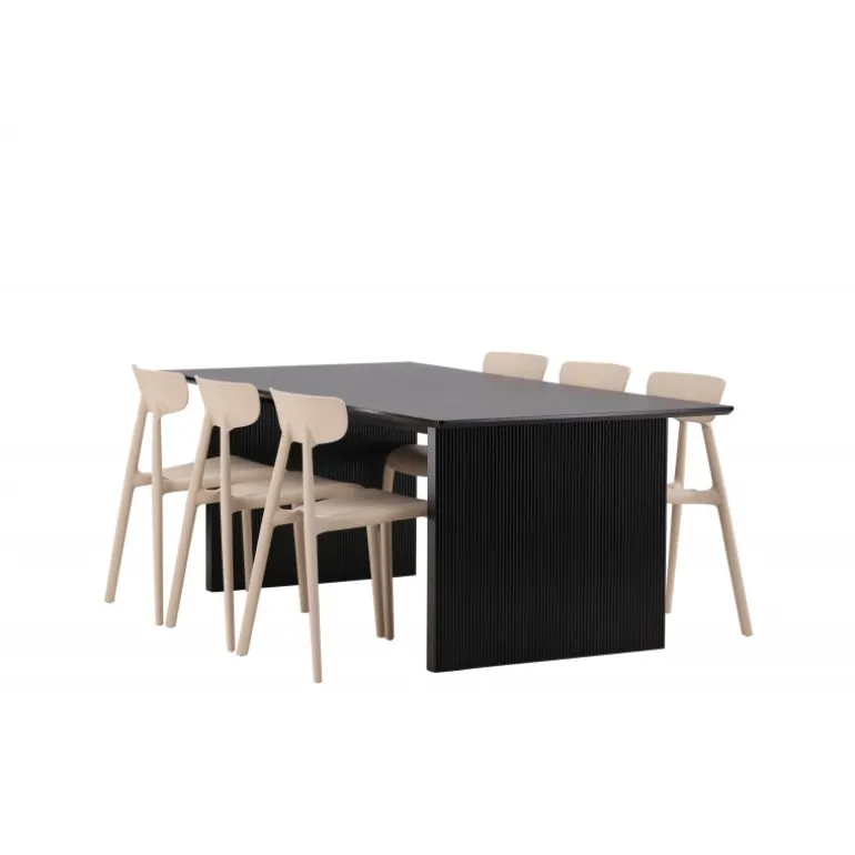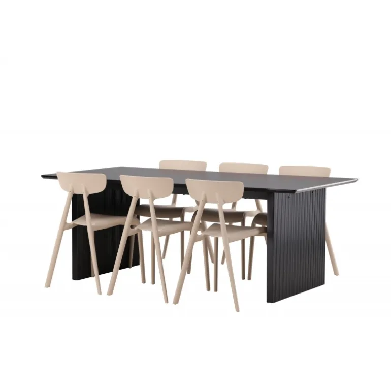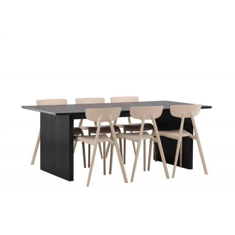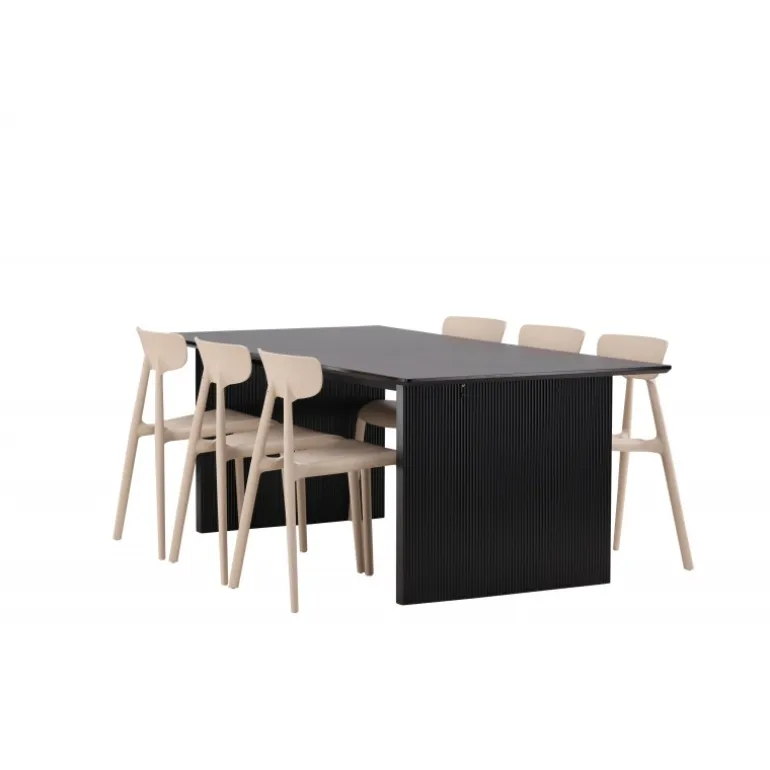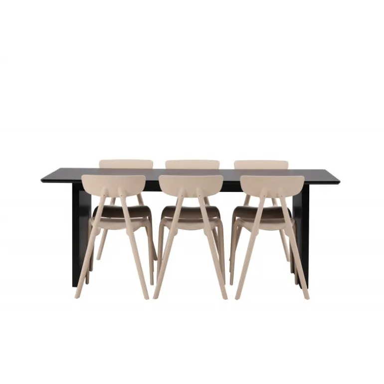 Et stilfuldt match, der står tidens prøve! Vail-spiseborde har lige nordiske former og er lavet af holdbart sort MDF – lige så stilfuldt som praktisk. Bordpladen er tynd i et rektangulært design og balancerer på to robuste træplader, der udgør understellet. Her i fremragende kombination med vores dejlige spisebordsstole fra Ursholmen-serien. Lavet af holdbar plast i en slank beige farve, der er nem at matche med andre møbler. Stolen har en pæn ryg, lidt dybere sæde og let udadgående ben i skandinavisk design. Skab et hyggeligt midtpunkt at samle dine kære ved!