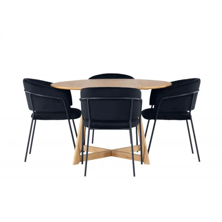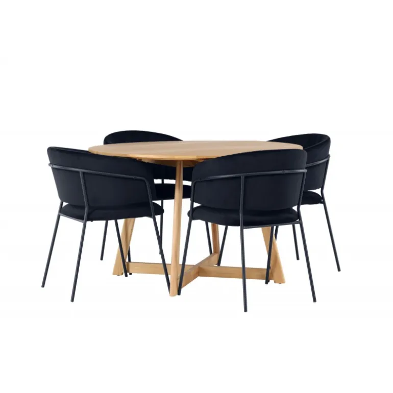 Med en kombination af stil og komfort vil dette spisebordssæt forvandle din stue til en oase af elegance og varme! Vores runde spisebord Yadikon er lavet af højkvalitets gummitræ og har en smuk egetræsfinish, der tilføjer et tidløst look til din indretning. Det runde bordplade betyder, at ingen ender på kanten, hvilket er perfekt til familiemiddage. De let udadbuede bordben mødes smukt under midten af bordet, hvilket giver en stabil og stilfuld konstruktion. Matchende, sorte spisebordsstole fra Selma-serien komplementerer spisebordet på bedste vis. Disse stole har et elegant og fuldt polstret design med en let afrundet ryg og en sædehynde i luksuriøst velourstof. De smukke dekorative syninger tilføjer et ekstra touch af eksklusivitet. Stolebenene er smalle og lavet af sort stål, hvilket giver en moderne kontrast til stolens bløde look. Her får du virkelig en vidunderlig kombination af bæredygtige materialer, skinnende stof, klassiske farver og luksuriøst design, der står tidens test i dit hjem!