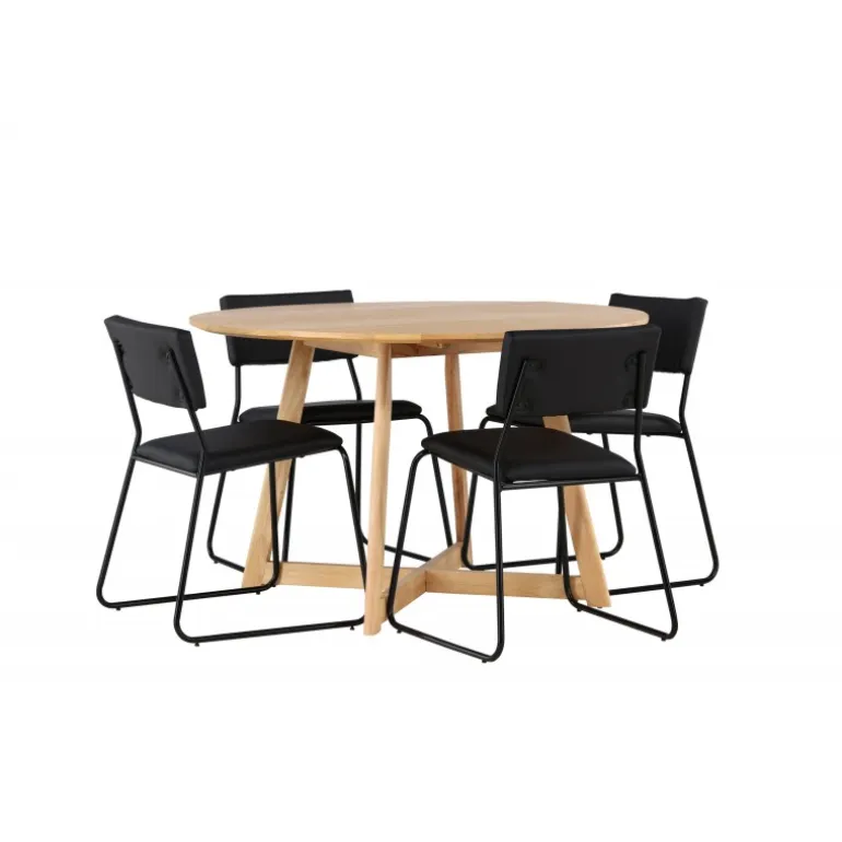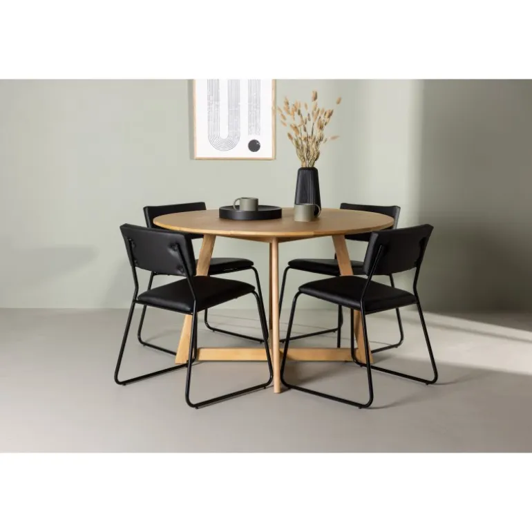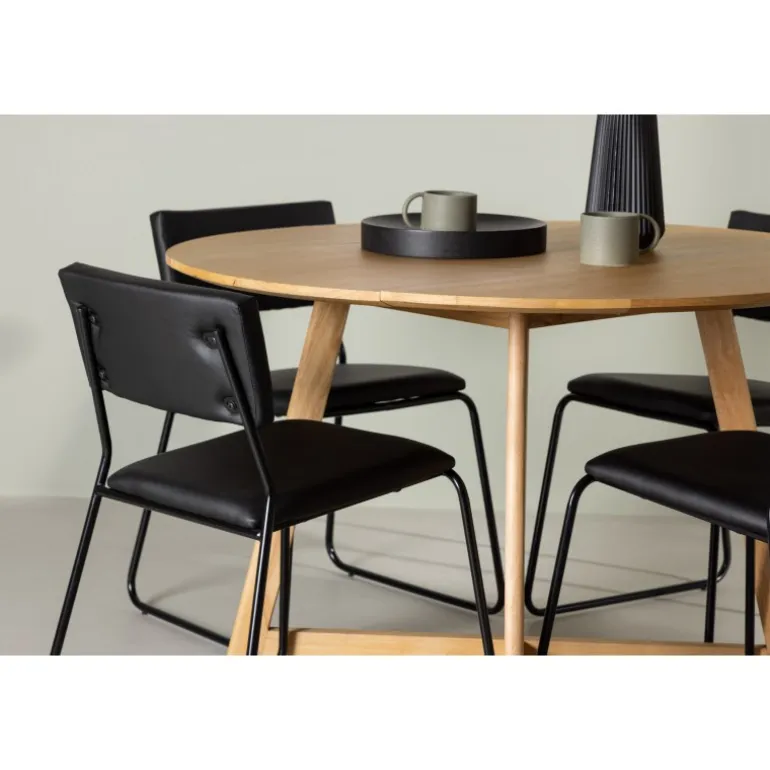 Her får du en stilfuld Spisebordssæt til hjemmets hjerte, der kombinerer minimalistiske former med klassiske materialer! Vores runde spisebord Yakidon er lavet af holdbart gummitræ og har en egefarvet finish, der bidrager til et nostalgisk look. Bordpladen er rund og de let udfladede ben på bordet mødes under midten af bordet, hvilket giver en elegant og balanceret stil til det samlede indtryk. Her i fantastisk kombination med sorte spisebordsstole fra Kenth-serien. Stolens minimalistiske og moderne design giver en luftig følelse i rummet, mens den tilbyder optimal komfort. Med sit sorte polyurethanlæder og polyesterbetræk giver Kenth spisebordsstolene en følelse af luksus og elegance. Du kan læne dig tilbage og slappe af, mens du nyder et lækkert måltid. De dekorative og smalle jernben vil ikke kun tilføre stabilitet, men også et moderne præg til din indretning. Skab en behagelig og indbydende atmosfære, hvor hvert måltid bliver en fornøjelse for hele familien!
