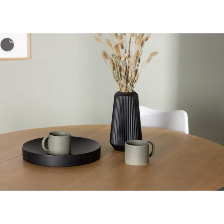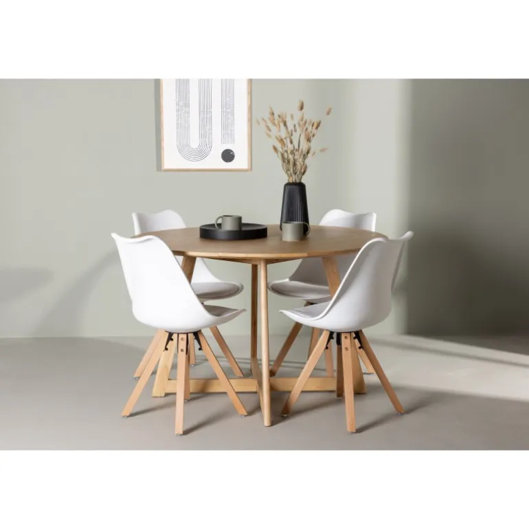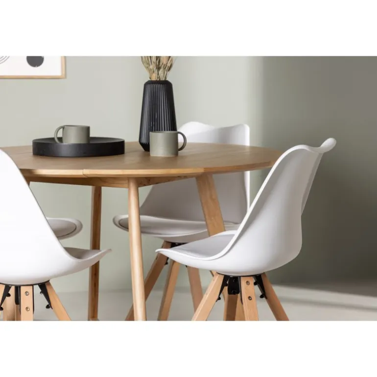 Velkommen hjem til dit drømmested, hvor stil og komfort kombineres i et utroligt spisebordssæt! Vores runde spisebord Yakidon har en rund bordplade med foldbare ender, der hurtigt tilpasser sig dine behov. Det giver dig fleksibilitet til både små og store sammenkomster. Med let udadbuede ben, der danner et smukt kryds på gulvet, tilføjer bordet også et moderne og stilfuldt touch. Bordet er lavet af høj kvalitet MDF og gummitræ, hvilket giver en følelse af tidløshed og stabilitet. Men det er ikke kun smukt at se på; det er også praktisk og let at rengøre. Her er spisebordet matchet med vores vidunderlige stole fra Zeno-serien. Stolenes indbydende design med hvid plastryg og sæde samt den indbyggede sædepude tilbyder behagelig siddekomfort til lange måltider. Med sin elegante enkelhed komplementerer Zeno-stolen Yakidon-bordet perfekt. Skab et hyggeligt midtpunkt i dit hjem med dette spisebordssæt og oplev den perfekte kombination af stil, funktionalitet og komfort!