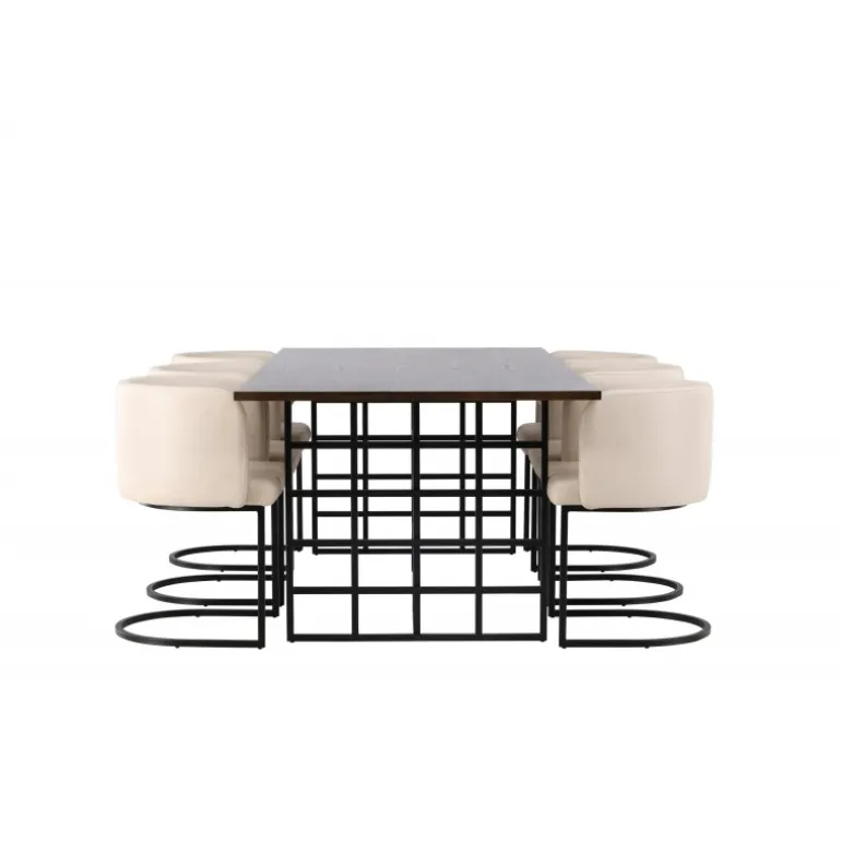 Et luksuriøst Spisebordssæt i en industriel stil og moderne design er måske lige det, din stue har brug for, for at give den et trendy løft! Vores rektangulære spisebord fra Ystad-serien med sin industrielle design bliver et fantastisk midtpunkt i hjertet af dit hjem. Bordet har en rustik, mørkebrun MDF-bordplade med egetræsfiner. Men hvad der virkelig fortjener ros for bordet, er de to dekorative sorte metalbaser med deres industrielle design. Disse detaljer giver spisebordet et moderne touch, der virkelig skiller sig ud. Dimensionerne på bordet er 100x220cm. Her, parret med vores storslåede spisebordsstole fra Simrishamn-serien. Denne stol er lige så komfortabel, som den er stilfuld, og vil skabe en luksuriøs atmosfære omkring dit spisebord. Det fuldt polstrede sæde og den afrundede ryglæn i beige TC-stof giver en følelse af luksus og elegance. Dens minimalistiske sorte stålramme supplerer perfekt det industrielle design af spisebordet. Med dette stilfulde Spisebordssæt vil du føle dig som en trendsætter, og din spisestue vil blive det bedste samlingssted for alle sociale måltider!