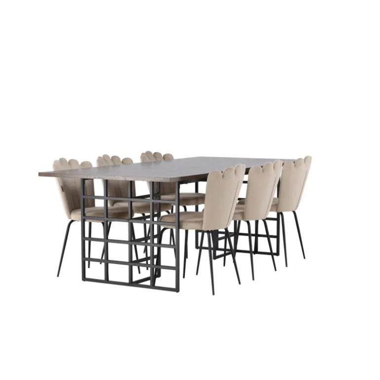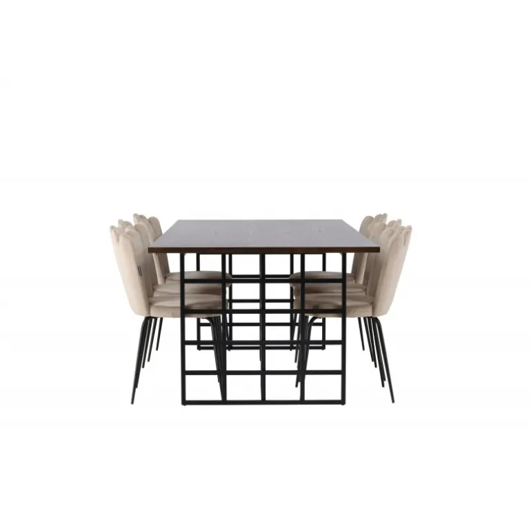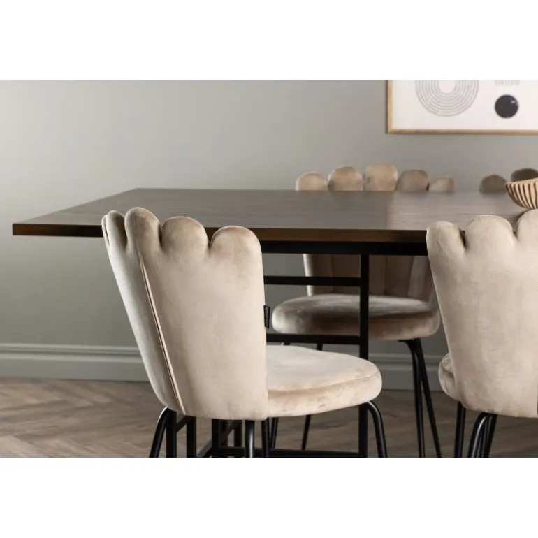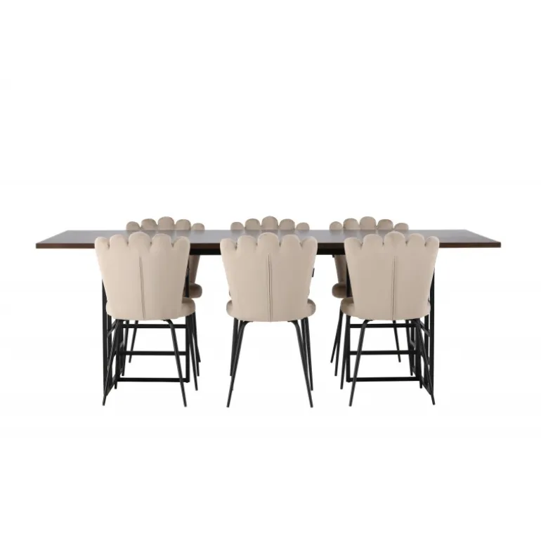 Et elegant og storslået spisebordssæt, der udstråler luksus, komfort og modernitet på den bedst mulige måde! Med en smuk mørkebrun, rektangulær bordplade lavet af MDF med egetræsfiner, udstråler vores spisebord fra Ystad-serien både luksus og kvalitet. Dets to dekorative sorte metalbaser giver et moderne twist med deres industrielle design, og skaber et fantastisk fokuspunkt i din stue. Bordets dimensioner: 100×220 cm. Sammen med vores fløjlsstole fra Limhamn-serien bliver dette spisebordssæt komplet. Med en dekorativ skalformet ryglæn og elegant dekorativ syning, tilbyder denne stol en stilfuld og hyggelig følelse. Det afrundede sæde er polstret i en smagfuld beige fløjlsstof, hvilket tilføjer et ekstra touch af luksus. De sorte pulverlakerede metalben giver ikke kun stabilitet, men også en elegant kontrast til det elegante stof. Denne stol og spisebordssæt bliver hurtigt en favorit i mange hjem og interiørstile. Inviter dine kære til mange festlige måltider fremover – der er plads til alle her!