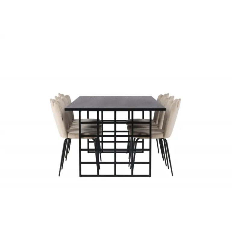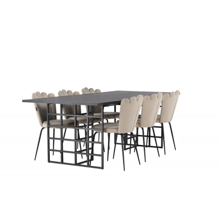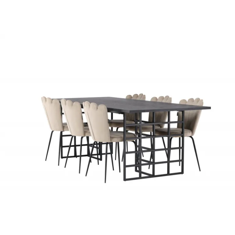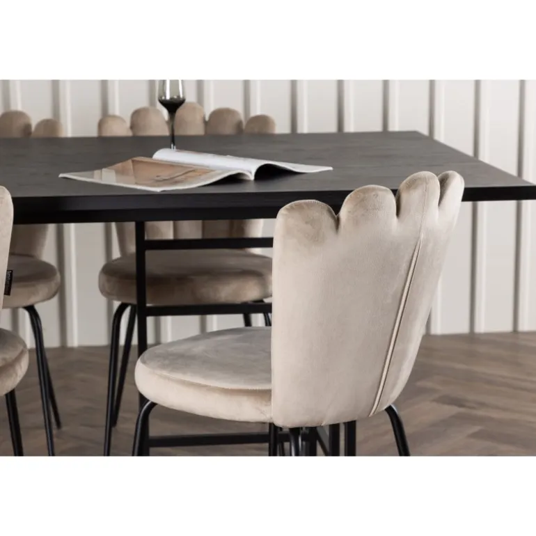 Oplev hyggen og charmen ved vores Spisebordssæt Ystad med stole Limhamn! Dette rektangulære spisebord har en smuk sortbejdset MDF-bordplade med egetræsfiner og to dekorative sorte metalrammer i industrielt design, som kombinerer stil og funktionalitet perfekt. Bordet måler 220×100 cm. Sammen med vores beige spisebordsstole fra Limhamn-serien skaber Spisebordssættet en indbydende atmosfære. De elegante stole har en dekorativ skalformet ryg med dekorative sømme og en rund, smagfuld beige velour sæde. Hver detalje er nøje udformet for at tilbyde enestående komfort og støtte. Stolens ben i sort pulverlakeret metal matcher bordet perfekt og skaber en harmonisk helhed i Spisebordssættet. Føl dig omfavnet af den subtile luksus fra velourstoffet, mens du nyder måltider eller socialiserer med venner og familie omkring dette fantastiske spisebord!