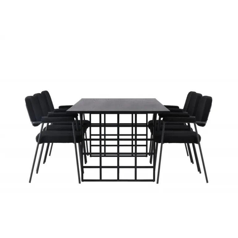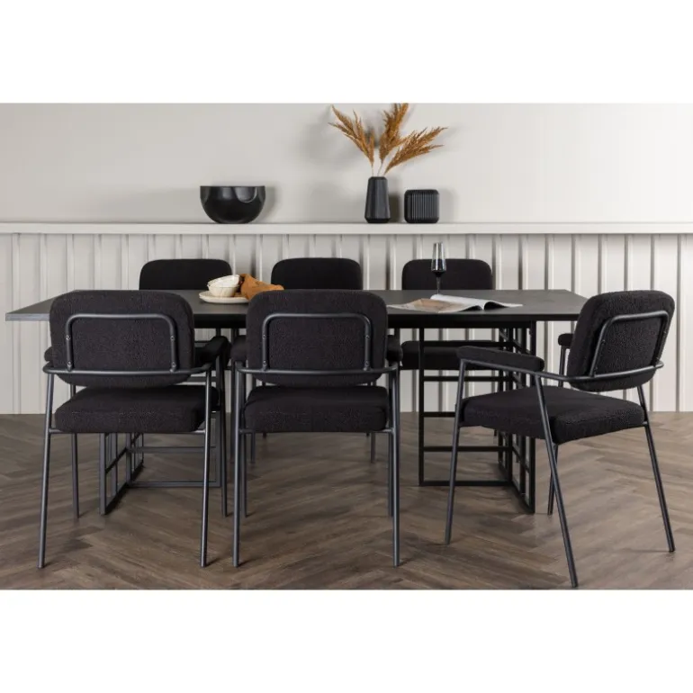 Indret hjemmets hjerte med et trendy og indbydende Spisebordssæt i industridesign og moderne stil! Vores rektangulære spisebord Ystad har en smuk sort-sodet bordplade lavet af MDF med egetræsfinér, hvilket bringer en naturlig og varm følelse til rummet. Bordets stel er lavet af sort metal og har et industrielt design, der tilføjer et moderne og trendy touch til det overordnede udseende. Bordets dimensioner: 220×100 cm. Sammen med det industrielle spisebord Ystad tilbyder vi vores sorte spisestole fra Yesterday-serien. Disse stole i skandinavisk design har en elegant fuldpolstret sæde i sort bouclé-stof, som ikke kun giver en luksuriøs følelse, men også komfort i verdensklasse. De slanke stoleben og integrerede armlæn i sort metal giver stolene en moderne og strømlinet profil, der perfekt komplementerer bordets design. Tag din indretning til nye højder med Ystad Spisebordssæt. Dette imponerende spisebord kombinerer tidløs elegance med et strejf af industrielt design, hvilket skaber en unik og iøjnefaldende æstetik, der vil få din spisestue til at skille sig ud!