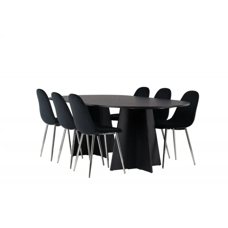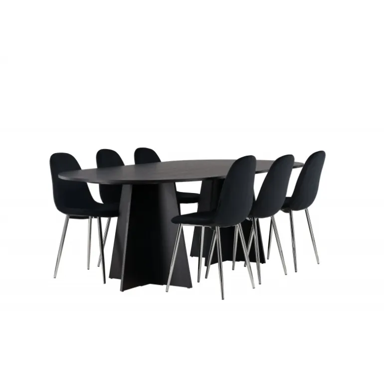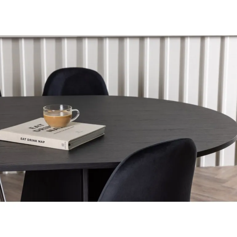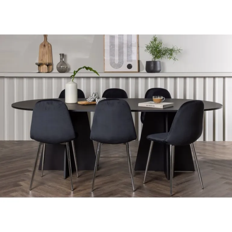 Det skal føles fantastisk at komme hjem! Her har du et luksuriøst spisestuesæt, der udstråler elegance, komfort og ikke mindst en tidløs, slank sort farve! Vores ovale spisebord, Bootcut, lavet af holdbart MDF med finer, har et moderne design, der hurtigt imponerer. Den tynde bordplade skaber en minimalistisk følelse, samtidig med at den tilbyder rigelig plads til dine kære. Den unikke base med to konturerede ben i et åbent design tilføjer et moderne touch til din spisestue. Den kontrastfyldte kombination af den slanke bordplade og den robuste base giver et unikt og sofistikeret udseende, der straks løfter den modebevidste atmosfære i dit hjem. Bordets dimensioner: 115×230 cm. Her i perfekt kombination med vores sorte spisebordsstole fra Polar-serien. Disse elegante stole har et fuldt polstret design, der udstråler en følelse af luksus og komfort. De krombelagte metalben tilføjer et moderne touch og bidrager til stolens stabilitet og holdbarhed. Med deres let buede ryglæn og sæde i sort velourstof tilbyder Polar et slankt og indbydende udseende, der perfekt komplementerer bordet og skaber et indbydende ensemble. Tag plads, inviter din familie og venner, og nyd sammen omkring et hyggeligt spisestuesæt, der sælger sig selv med sit skandinaviske design, høje komfort og tidløse udtryk!