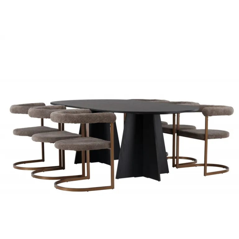 Velkommen hjem til en følelse af luksus og modebevidsthed. Dette skandinaviske spisestuesæt vil utvivlsomt blive en ny favorit i hjertet af dit hjem! Vores ovale spisebord fra Bootcut-serien har en minimalistisk oval bordplade i sort MDF med finér, der skaber en slank kontrast til den markante ramme. To konforme ben i et åbent design giver ikke kun stabilitet, men skaber også et visuelt indtryk af design og præcision. Bordet måler 115×230 cm. Sammen med vores moderne spisebordsstole fra Morning-serien, er dette spisestuesæt komplet. Med deres afrundede ryglæn og polstrede sæder i sort boucléstof, tilbyder disse stole fantastisk komfort. Den minimalistiske sorte stålramme giver en stilfuld kontrast til stoffet og giver stolene et moderne touch. I dette sorte spisestuesæt er hver detalje omhyggeligt udvalgt for at skabe en følelse af eksklusivitet og passe perfekt ind i moderne hjemmemiljøer. Skab et storslået midtpunkt, der føles trendbevidst og holder i længden!