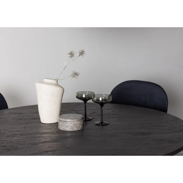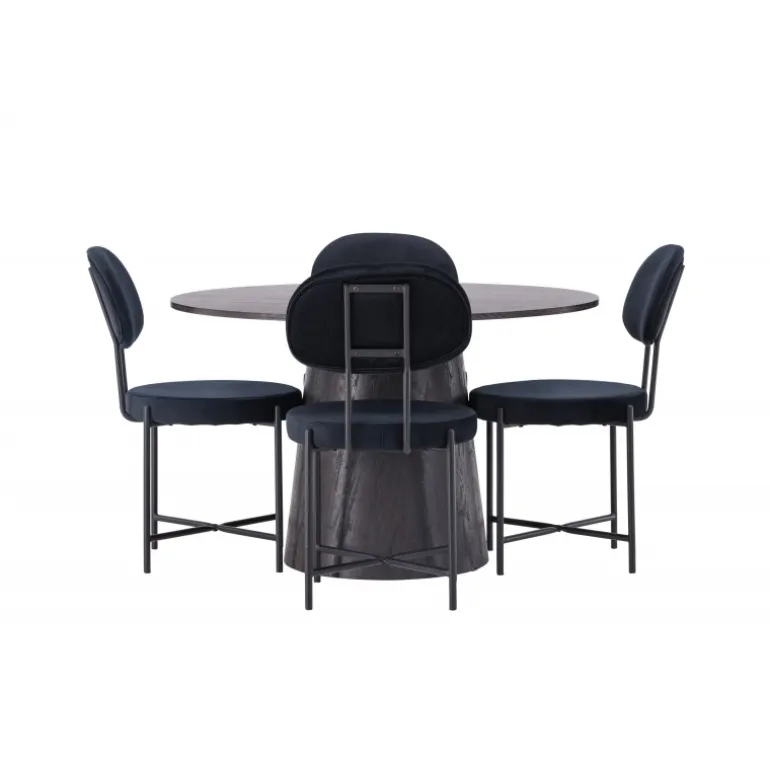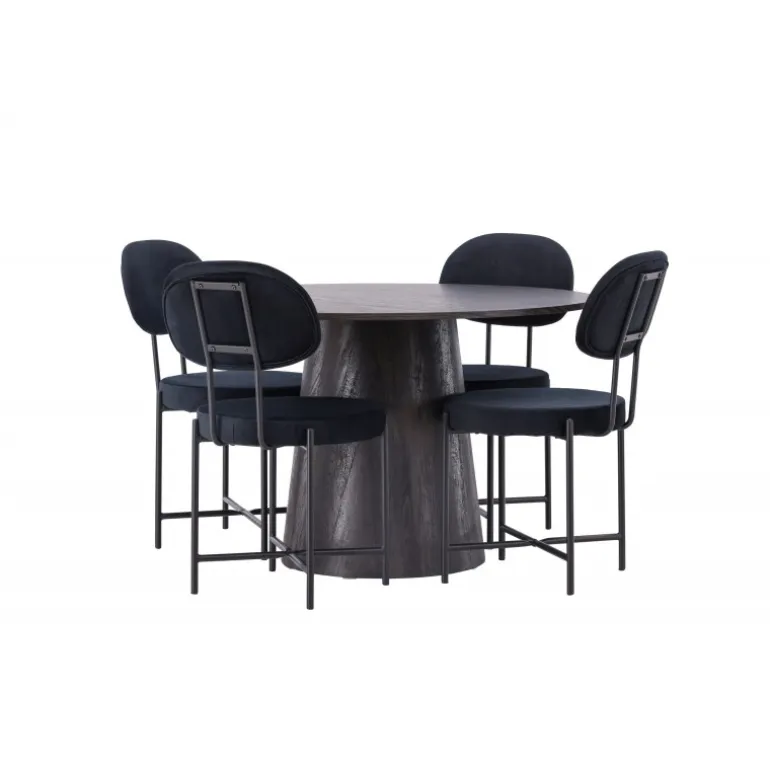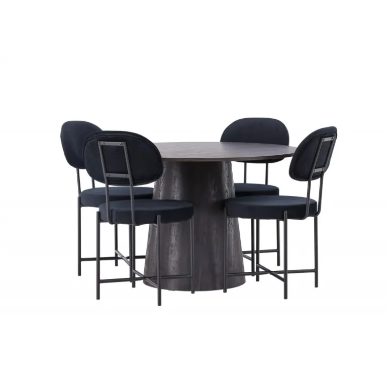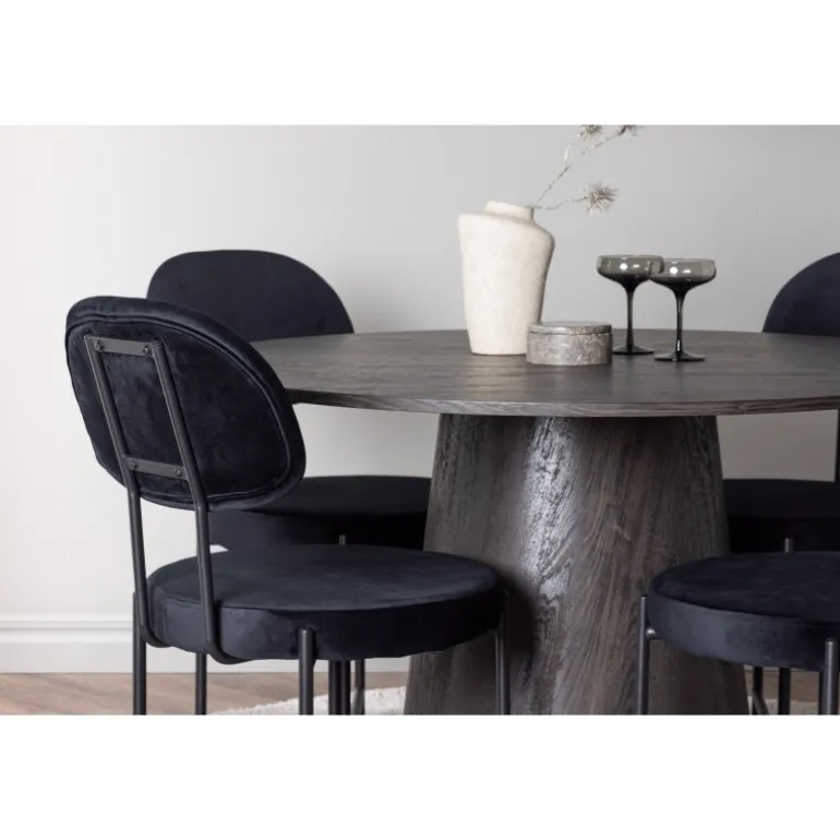 De runde former skaber en indbydende atmosfære! Vores vidunderlige, runde spisebord Lanzo har et overordnet design i brun MDF med en tynd top og en snoet cylindrisk ramme, der er centreret under midten af bordet. Her sammen med vores luksuriøse spisestuestole fra Stella-serien. Stolen har et trendy, skandinavisk design med et rundt sæde og ryglæn i sort velourstof og minimalistiske stoleben i sort stål. Sid behageligt – her ender ingen på kanten! Bordets diameter: 120 cm.