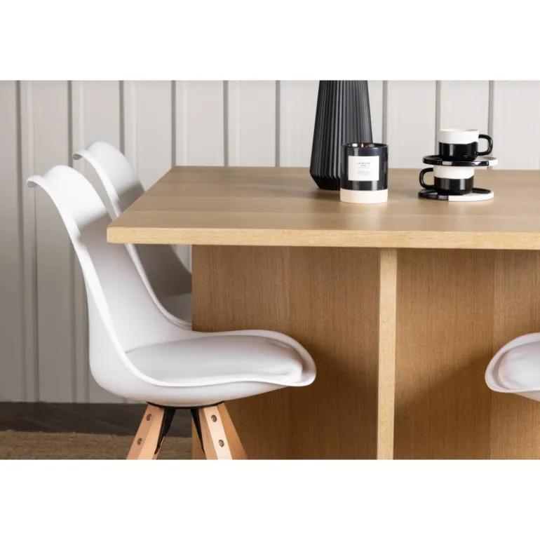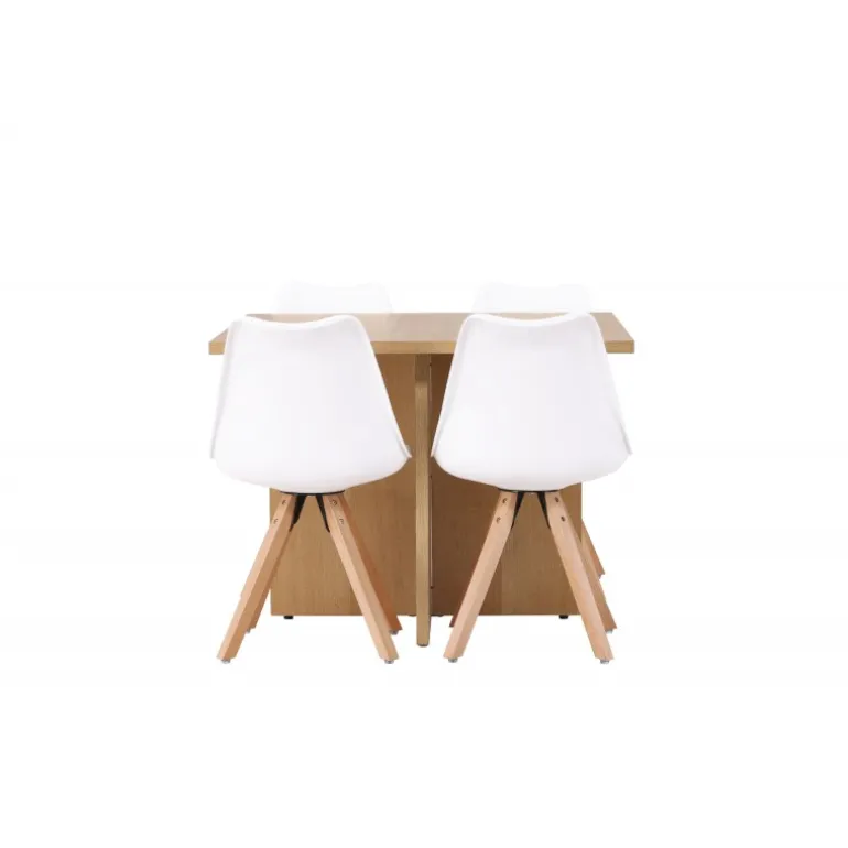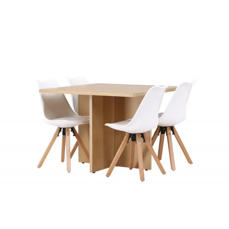 Det skal føles velkomment at komme hjem og blive mødt af et charmerende spisestuesæt, der inviterer til lækre måltider og hyggelige stunder! Vores træfarvede spisebord Leo er lavet af robust MDF i egetræsfiner og har en moderne kvadratisk bordplade. Den krydsede træramme giver bordet en unik og charmerende karakter. Bordets smarte størrelse gør det til en fremragende pasform selv i mindre køkkener, hvilket gør det til en ideel løsning for ethvert hjem. Bordets dimensioner: 100×100 cm. Sammen med det kvadratiske bord Leo, komplementerer vores moderne sorte spisestole fra Zeno-serien det, og inviterer til timers behagelig bespisning. Stolens ryglæn og sæde er lavet af hvid plastik og har indbygget sædehynde, der giver enestående komfort. Med deres træben skaber stolene en naturlig og indbydende atmosfære og matcher perfekt med bordet. Denne kombination af stil, komfort og funktionalitet vil give dig og dine gæster en følelse af velvære ved hvert måltid. Forny din indretningsstil med disse fantastiske møbler og skab mindeværdige øjeblikke ved spisebordet!