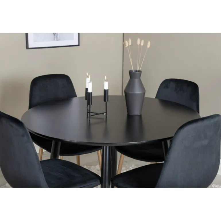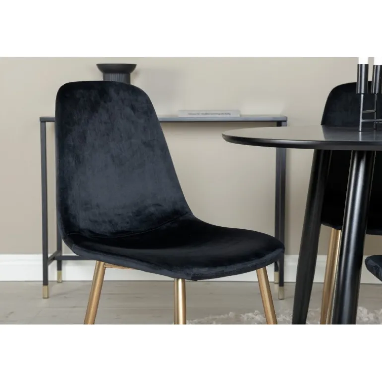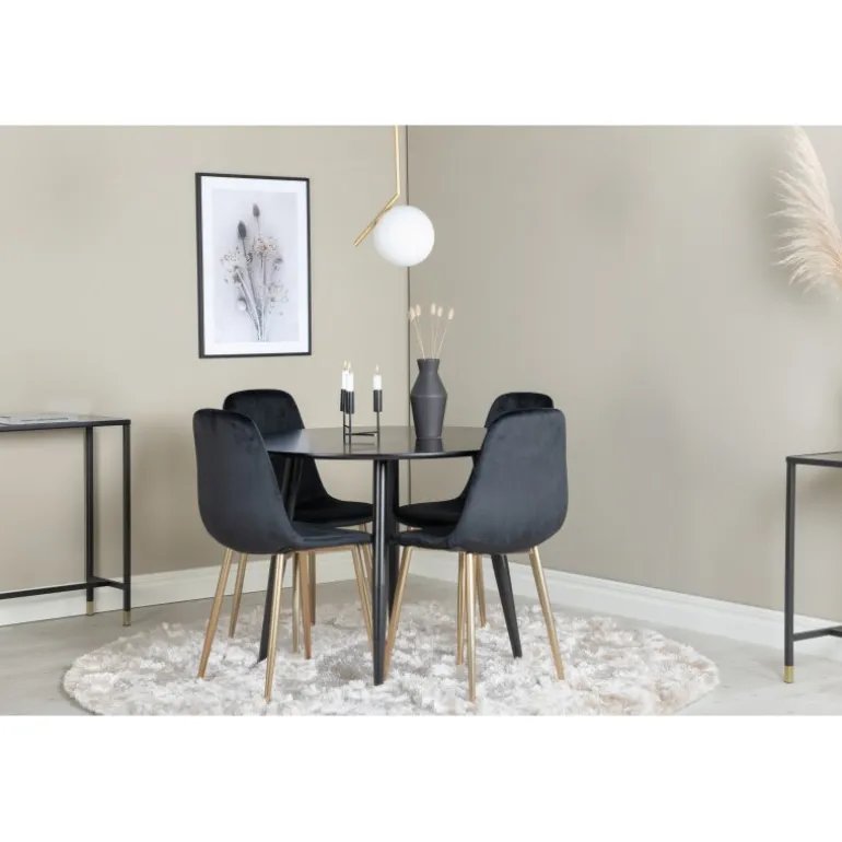 Et lille og smukt, men luksuriøst og trendy spisestuesæt. Plaza spisebordet er kombineret med Polar spisestolene – en perfekt spisestuesæt til en mindre plads! Plaza spisebord er lavet af sort MDF, som giver et elegant udseende, mens Polar stole tilbyder komfort og stil med deres sorte og guld polyester velour stof og stålben. Gør dit hjem mere stilfuldt og funktionelt med dette sæt.