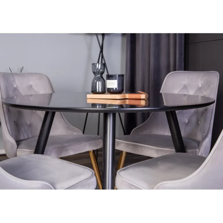 - Moderne design: Stilfuldt sort MDF bord og elegante Velvet Deluxe stole.