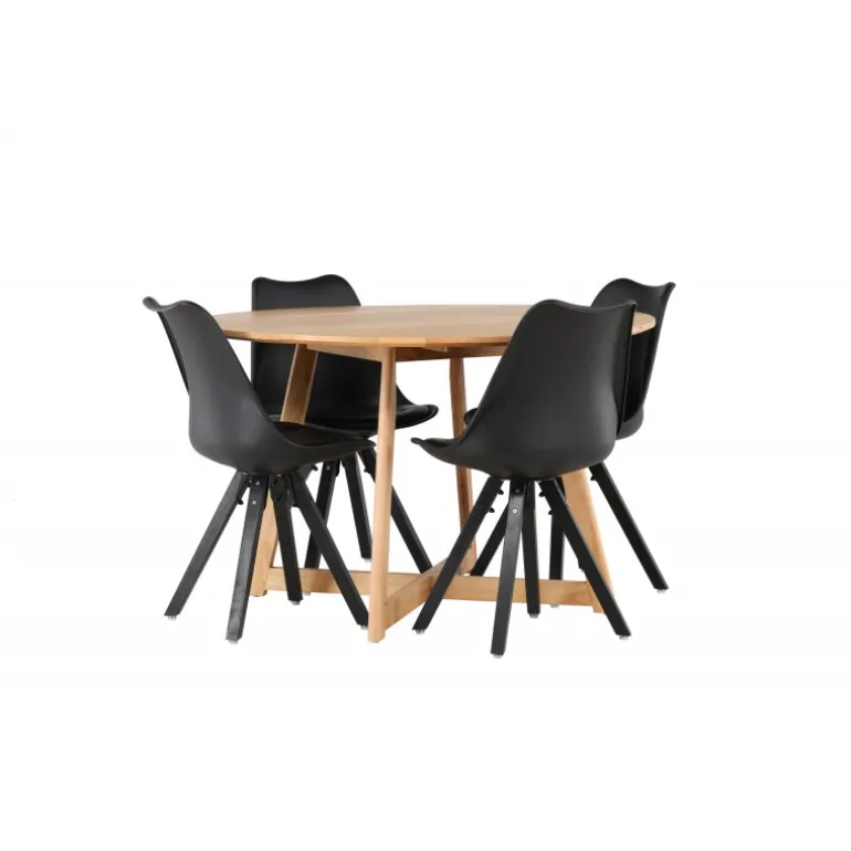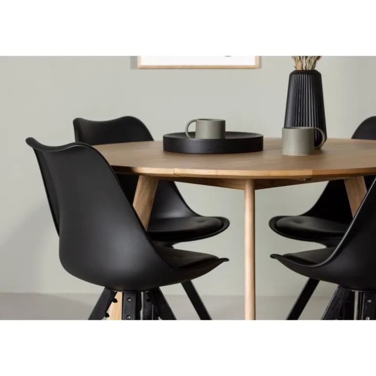 Et stilfuldt spisestuesæt, der virkelig fanger øjet, mens det tilbyder en række smarte funktioner skræddersyet til dine behov! Vores smarte spisebord, Yadikon, har sammenklappelige ender, der gør det nemt at justere bordets størrelse. Uanset om du skal have en hyggelig middag for to eller en større sammenkomst med venner og familie, vil Yadikon tilpasse sig for at skabe den perfekte atmosfære. Bordet har elegante, udsvungne ben, der mødes i et kryds på gulvet, hvilket giver en stabil og sikker base. Lavet udelukkende af egetræs-lignende MDF og gummitræ, modstår bordet tidens tand og bidrager til et klassisk look. Her parret med vores dristige Zeno-serie spisestuestole. Denne stol har et indbydende design med en sort plastikryg og sæde samt en indbygget pude, der tilbyder dejlig komfort. Du kan sidde i timevis uden problemer og nyde din spiseoplevelse på bedste vis. Med dette spisestuesæt får du ikke kun en praktisk og smuk Spisebordssæt, men også en følelse af luksus og elegance, der vil gøre hvert måltid hyggeligt og bekvemt. Forkæl dig selv med det bedste og lad denne gruppe blive stjernen i dit hjem!