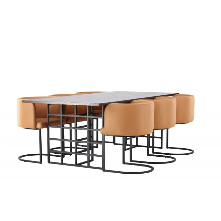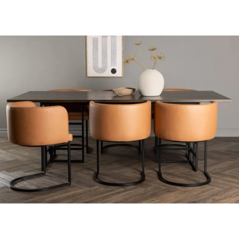 Skab en luksuriøs atmosfære i dit hjem og lad dette modebevidste spisestuesæt sætte tonen i din indretning! Vores rektangulære spisebord i industrielt design fra Ystad-serien imponerer hurtigt både dig og dine gæster. Med en smuk mørkebrun rektangulær bordplade lavet af MDF med egetræsfiner passer dette bord perfekt ind i enhver moderne indretningsstil. Bordets to dekorative baser i sort metal med industrielt design er prikken over i’et. Bordets dimensioner: 100x220cm. Her parret med vores komfortable spisebordsstole i moderne stil fra Simrishamn-serien. Denne stol er en kombination af stil og komfort og vil være en luksuriøs detalje omkring dit spisebord. Stolens fuldt polstrede sæde, beklædt med en elegant brun TC-stof, tilbyder en blød og behagelig siddeplads under lange måltider fyldt med latter og samtale. Ryglænet har en afrundet form, der giver ekstra støtte og komplementerer perfekt spisebordets moderne æstetik. Med sin minimalistiske sorte stålramme er Simrishamn-stolen et kunstværk i sig selv og giver en elegant kontrast til spisebordets design. Hvad mere kan man ønske sig? Dette spisestuesæt har det hele!